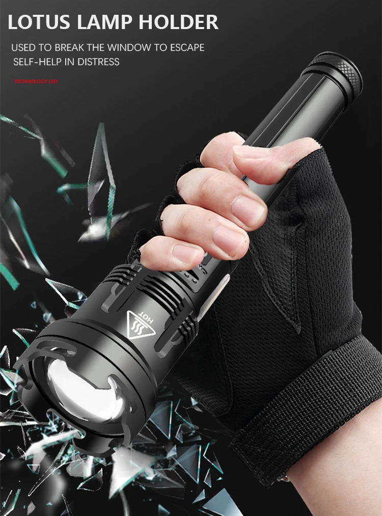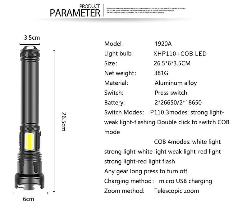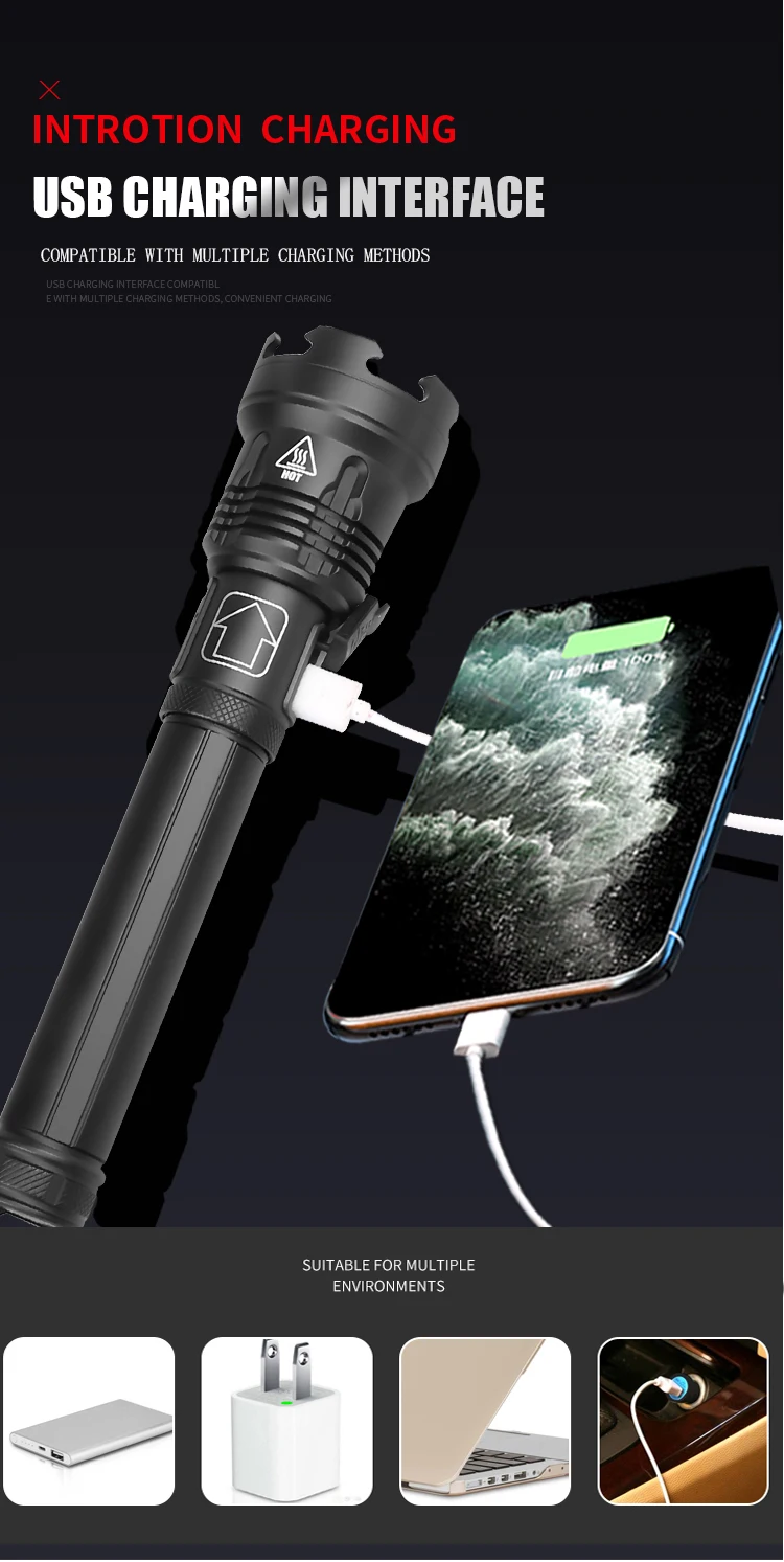 Характеристики: Высокий люмен P110 + Ближний свет COB красный и белый светильник, богатый функциями, подходит для наружного высокоточного дизайна зарядного порта, чтобы предотвратить проблему кривого зарядного порта, утолщенный водонепроницаемый штекер, обработка поверхности жестким окислением, износостойкий и не легко царапается, высокое качество