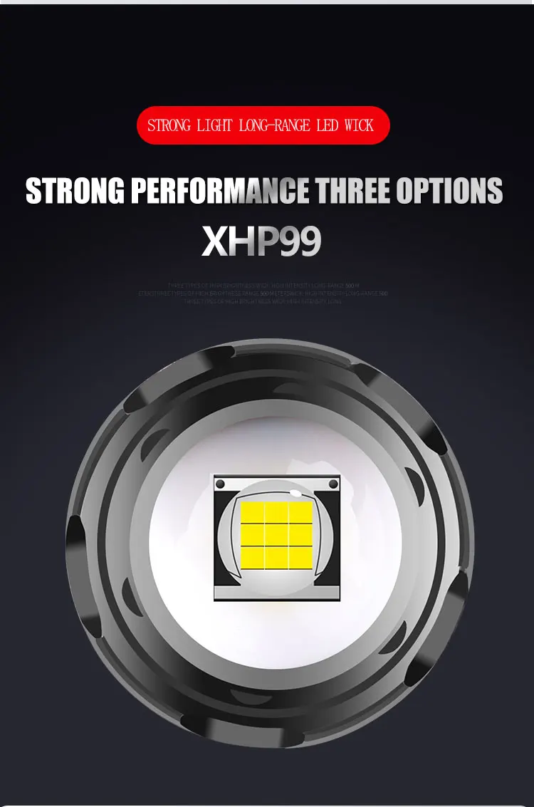 Характеристики: Высокий люмен P99 + Ближний свет COB красный и белый светильник, богатый функциями, подходит для наружного высокоточного дизайна зарядного порта, чтобы предотвратить проблему кривого зарядного порта, утолщенный водонепроницаемый штекер, обработка поверхности жестким окислением, износостойкий и не легко царапается, высокое качество