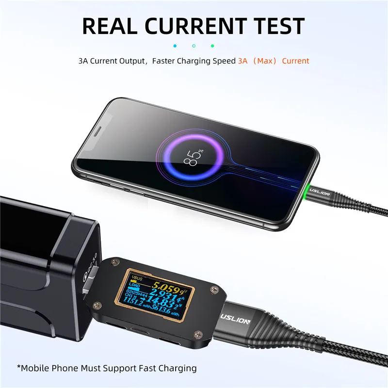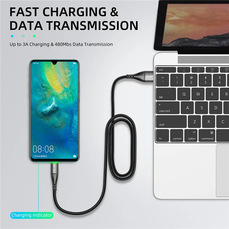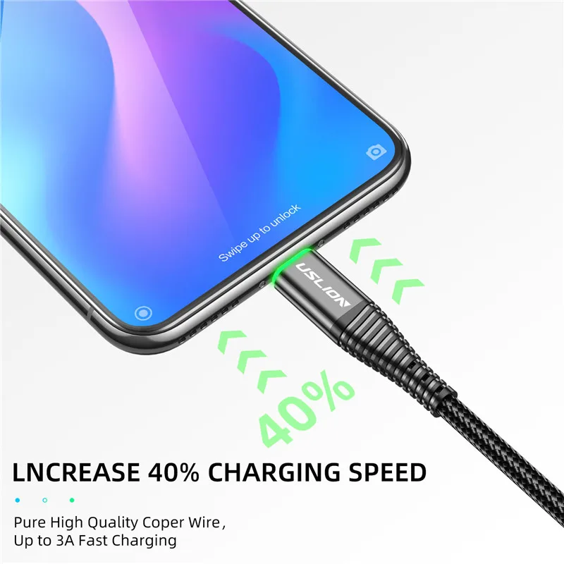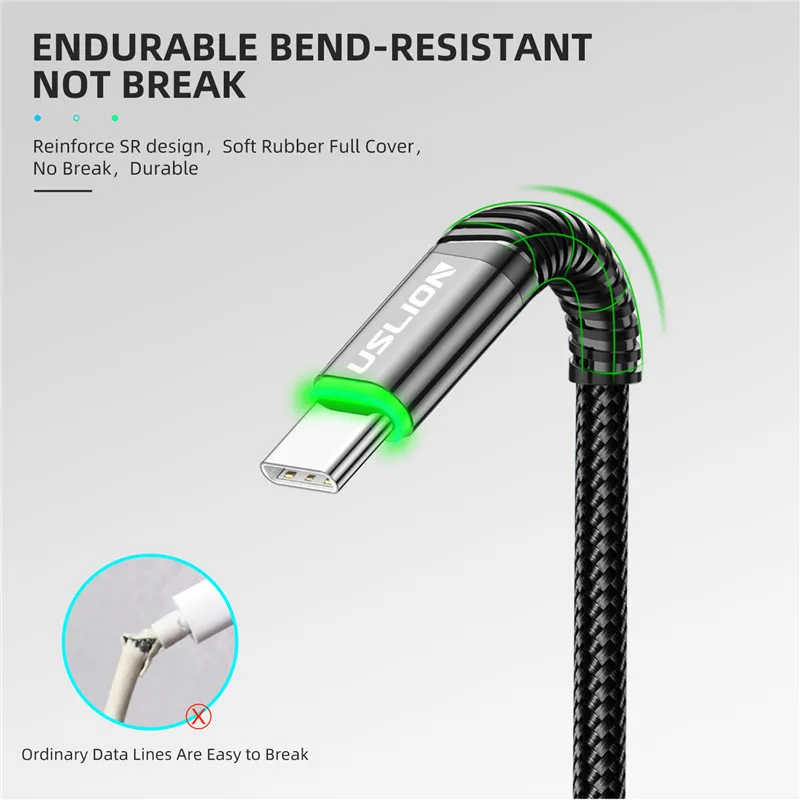 Кабель USLION USB Type-C, 2 м, 3 А, со светодиодной подсветкой, для быстрой зарядки телефонов Samsung, Xiaomi, Huawei, кабель для передачи данных
