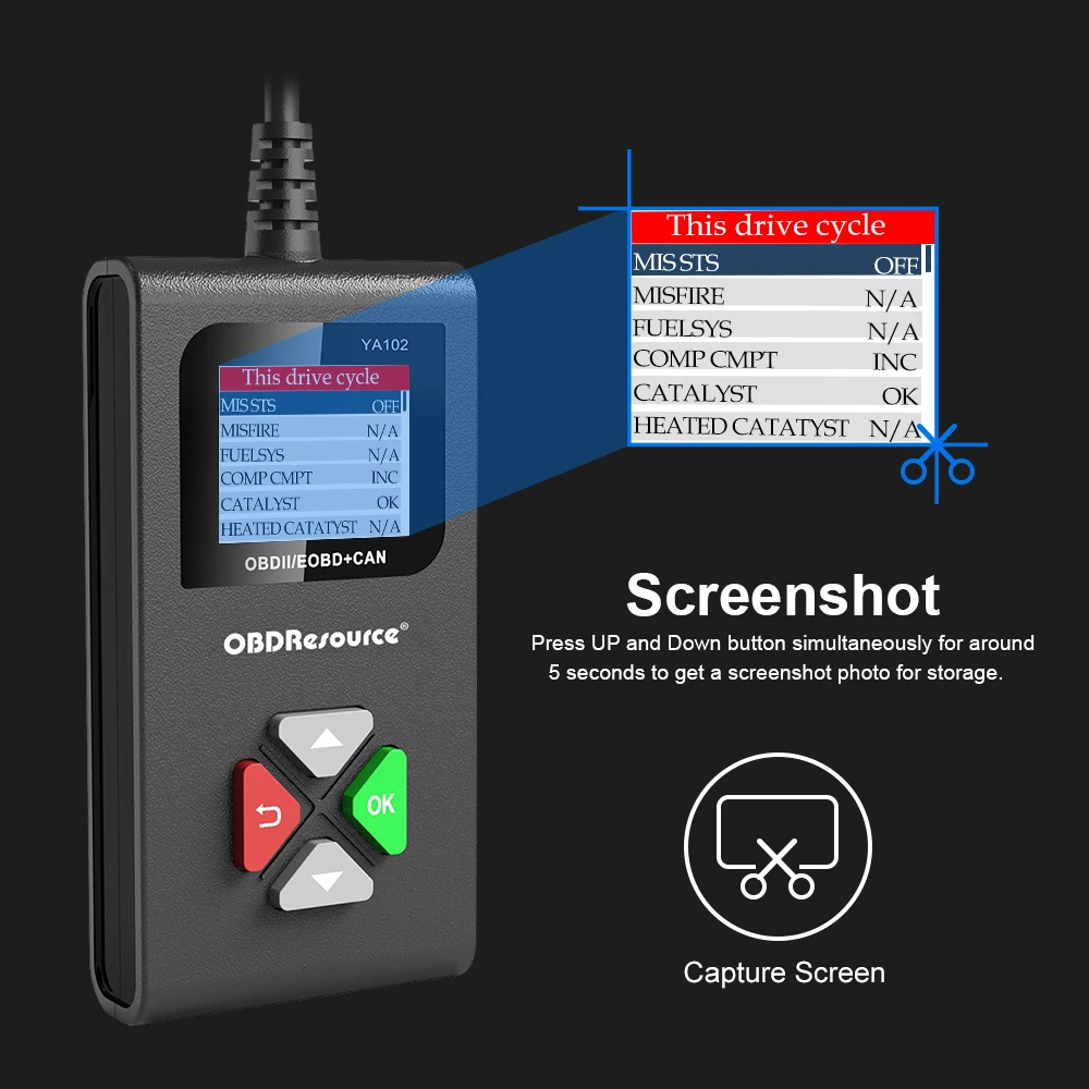 5. Функция скриншота:Вы можете одновременно нажимать кнопки «вверх» и «вниз» на этом сканирующем инструменте в течение 5 секунд, чтобы сделать скриншот вашего просмотра потока данных и внутренней памяти.
