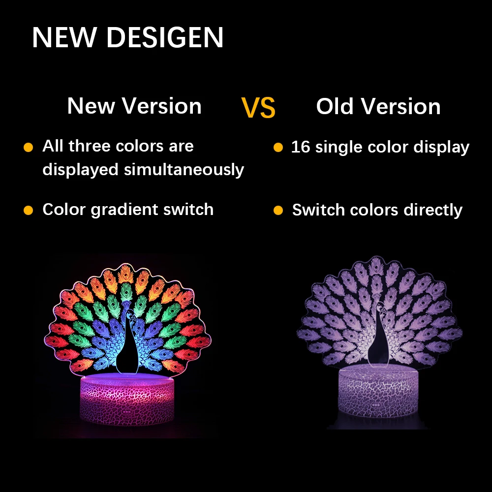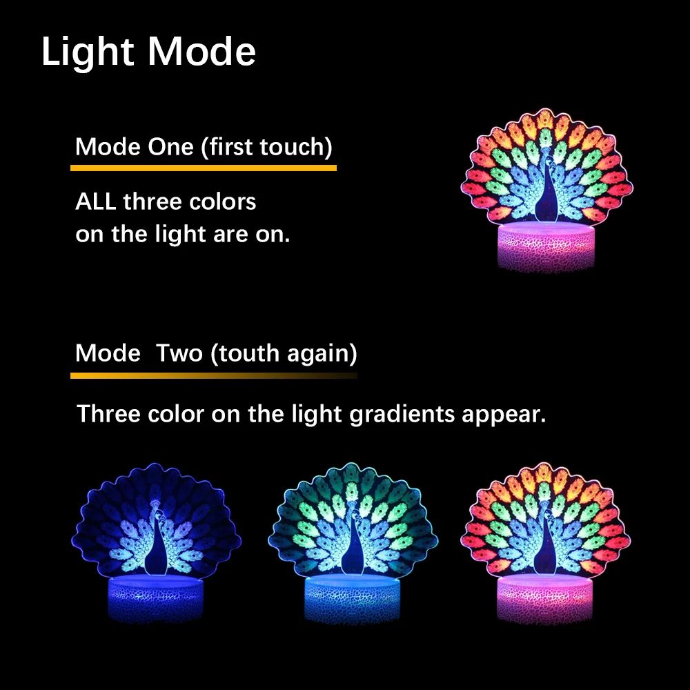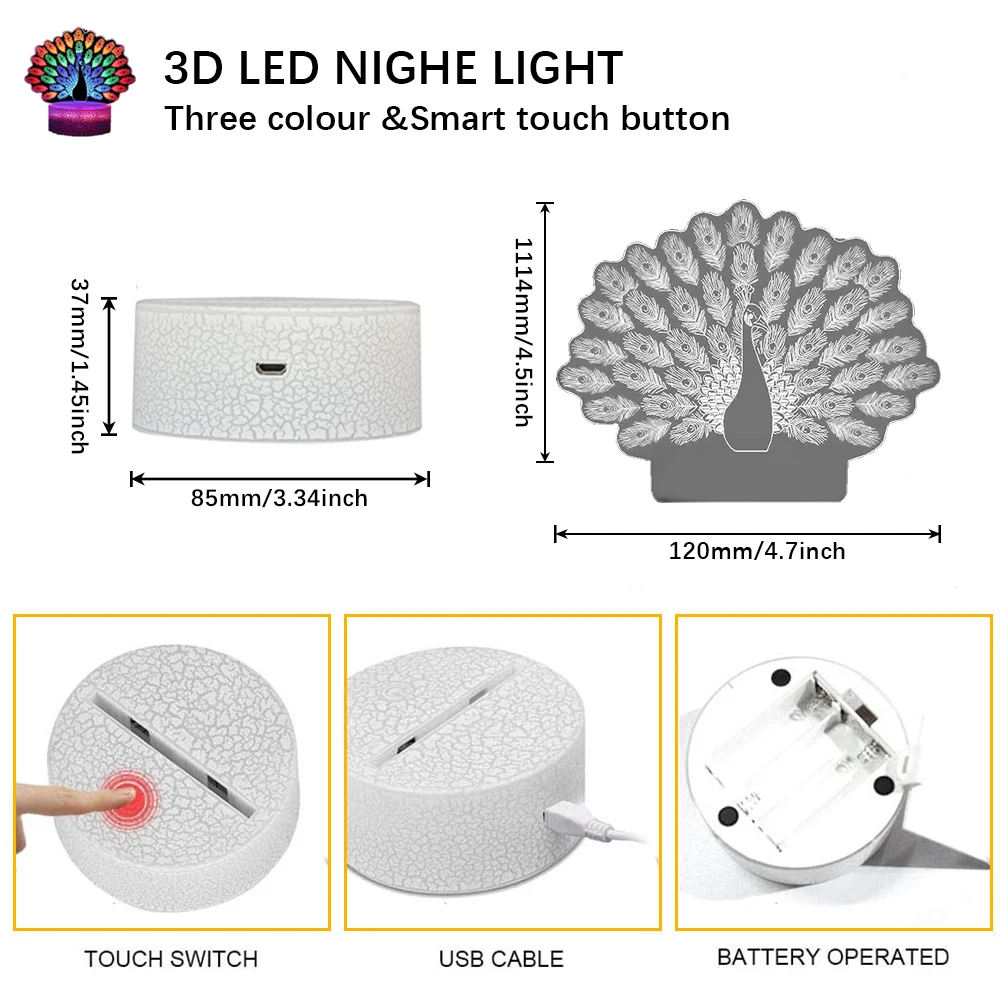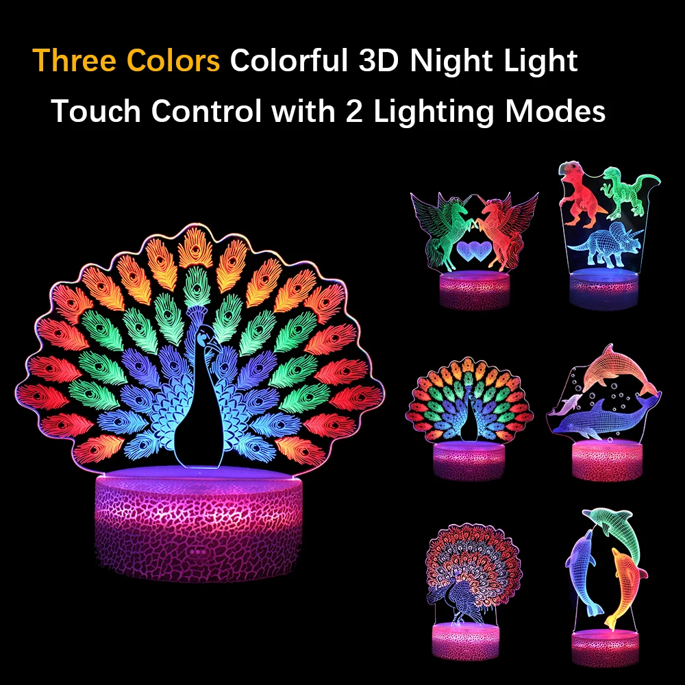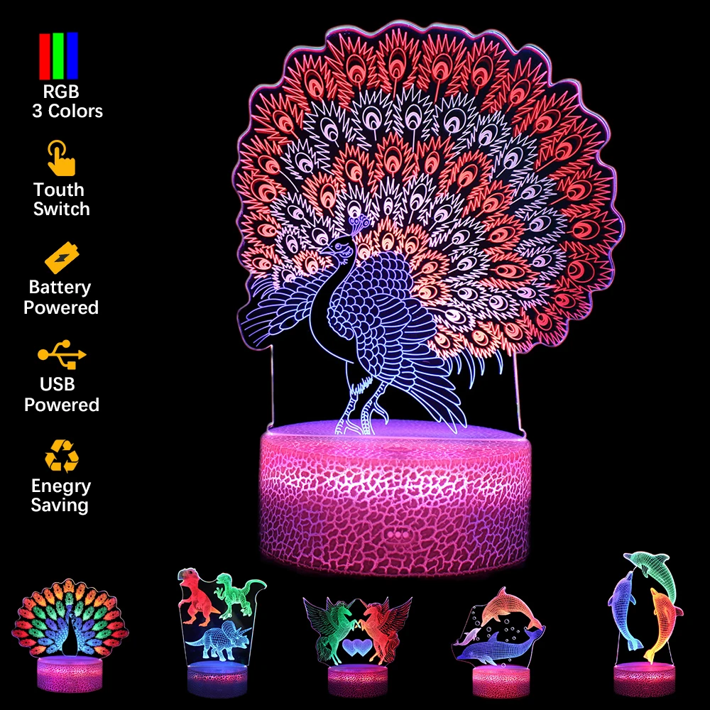 Лазерный ночник с 3 акриловыми пластинами, 3D Светодиодная лампа в виде павлина, новинка, светильник для спальни, декоративный ночник в виде динозавра, детский подарок, настольная лампа