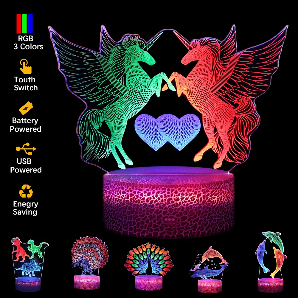Особенности:【Креативный 3D визуальный эффект 】3D светодиодный ночной Светильник изготовлен с лазерная гравировка технологии для того, чтобы создать великолепные оптические великолепные 3D Иллюзия с реалистичным 3D в форме животных дизайн. Лазерная гравировка акриловых деталей толщиной всего 5 мм, но обеспечивает волшебное 3D освещение, удобно и полезно.【Новый дизайн светового эффектаНовый 3D светодиодный Ночной светильник в комплекте3 акриловых пластиныИ 1 ABS Ночной светильник. Не только 3D стереоскопическое освещение, но и показать ваш красочный светильник ing эффект. Все три цвета на лампе включены в то же время, когда он работает. Прикоснувшись к базе Ночной светильник, вы можете переключаться между режимом градиента и трехцветным фиксированным режимом.【USB или батареи Powered】3D светодиодный Ночной светильник с питанием от USB (все указанные аккумуляторы входят в комплект поставки) заряжается или 3 * батарейки типа АА (не прилагаются). Две разные режимы зарядки при постоянном удовлетворить любые ваши потребности.[Идеальный подарок для детей]3D светодиодный ночник-светильник доступен в виде павлина, динозавра, единорога, Дельфина, 4 различных 3D рисунка животных для ваших детей на выбор, что делает их комнату более красивой и красочной. Это идеальный подарок на Рождество, Хэллоуин, день рождения, День благодарения, новоселье, выпускной подарок для ваших детей или друзей.【Детская безопасность 】Высокое качество светодиодный светильник источник света, низкое энергопотребление, длительный срок службы, подходящие к любому акриловый светильник (направляющая планка осветителя), принесет вам мягкий, но достаточно яркий эффект освещения, не ослепительно и высокой температуры, существует, он безопасен для ваших детей и безвреден для глаз детей.
