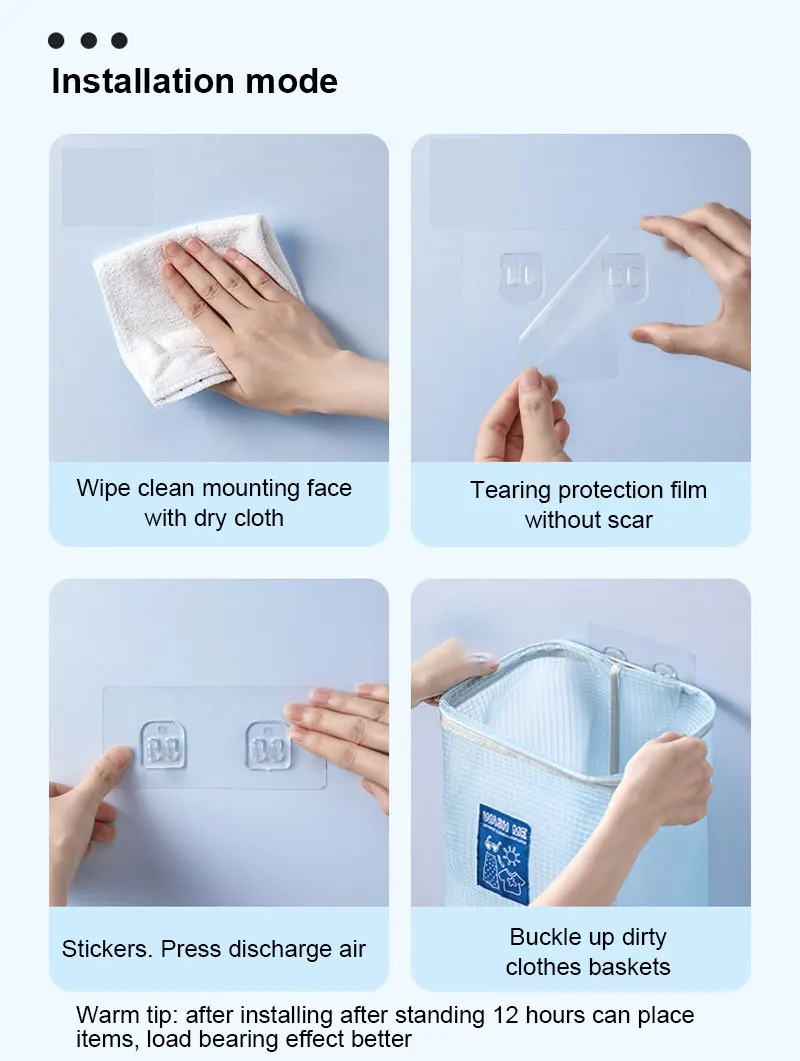 * Шаги по установке: Очистите поверхность установки сухой тряпкой; Оторвите защитную пленку без маркировки; Прикрепите и прижмите к выхлопному воздуху; Пристегните корзину для белья.