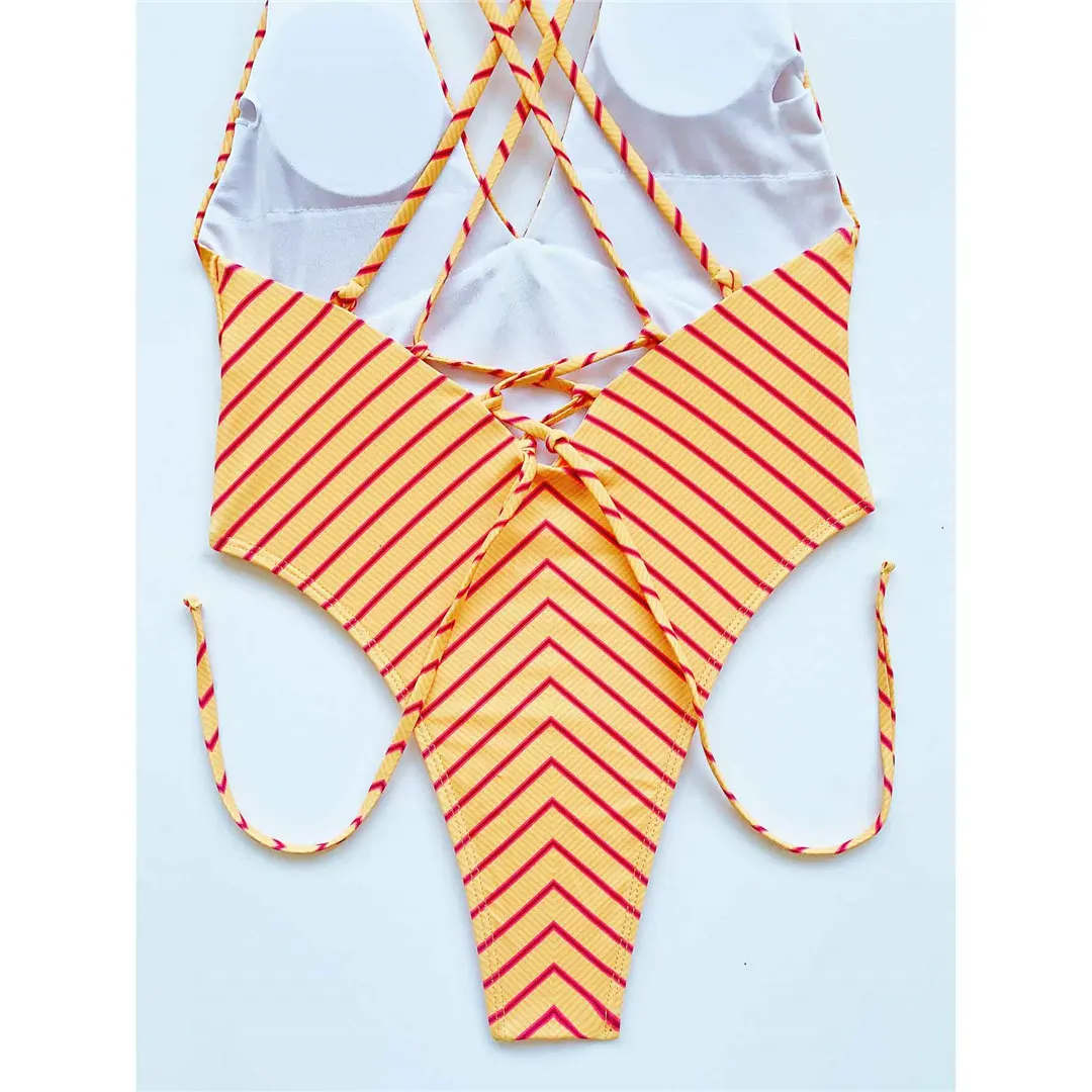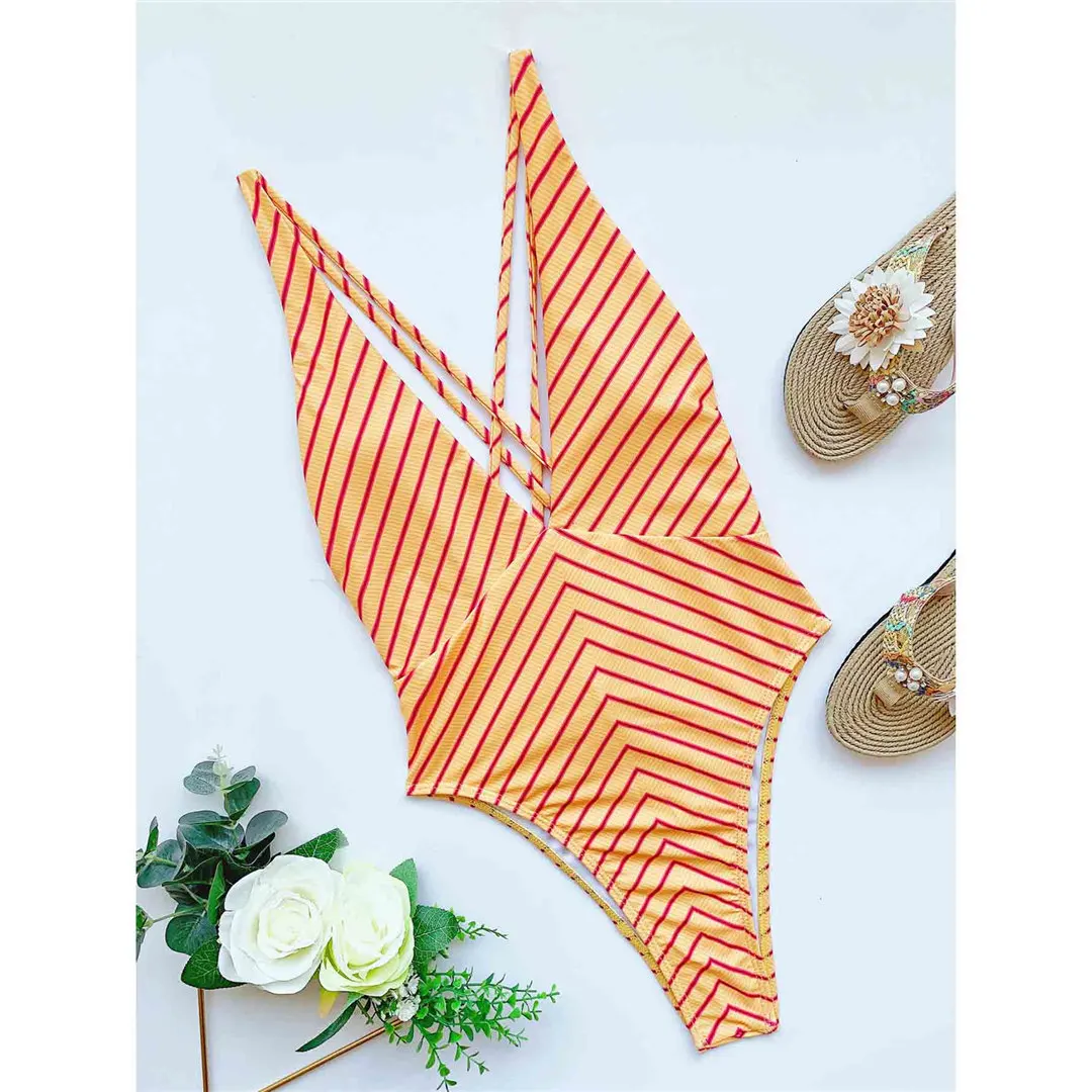 Новый сексуальный синий монокини с глубоким V-образным вырезом и открытой спиной, женская одежда для плавания, цельный купальный костюм, желтый полосатый купальный костюм с высоким вырезом