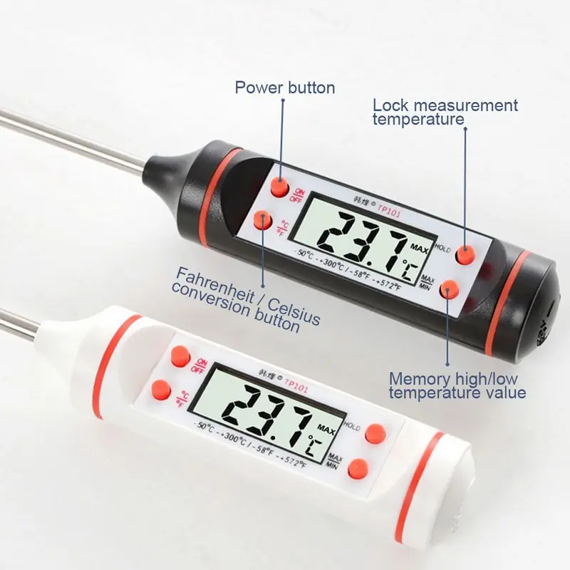 Особенности:<Безопасный материал: термометр изготовлен из высококачественного пластика с зондом из нержавеющей стали, нетоксичный, без запаха, устойчивый к ржавчине.<Автоматическое выключение: Этот термометр для приготовления пищи автоматически выключается через 10 минут без использования.<Функция удержания данных: разработан с функцией удержания данных, просто нажмите кнопку, чтобы удерживать данные температуры и нажмите еще раз, чтобы разблокировать его.<Единицы измерения: ℃ и ℉ могут быть легко переключены.<Макс/мин: вы просто нажмите кнопку, чтобы проверить предыдущую макс. запись и нажмите еще раз, чтобы показать вам минимальную запись, и третий вернется к нормальному дисплею.<Простота в использовании: Просто вставьте зонд в еду или жидкость и получите температуру<Широкое применение: идеально подходит для огромной индейки, курицы, приготовления хлеба, приготовления шоколада, барбекю, горячей воды, горячего молока и даже ванной воды и многого другого.