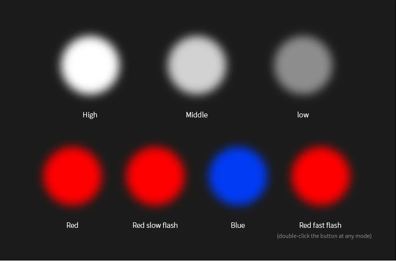(Левая клавиша питания):Высокий/средний/слабый/выклКрасный и синий светильник(Правая клавиша питания):Красный/красный медленная вспышка/синий/Красная быстрая вспышка (дважды нажмите на кнопку в любом режиме)/выклДля любого режима нажмите кнопку для 2s