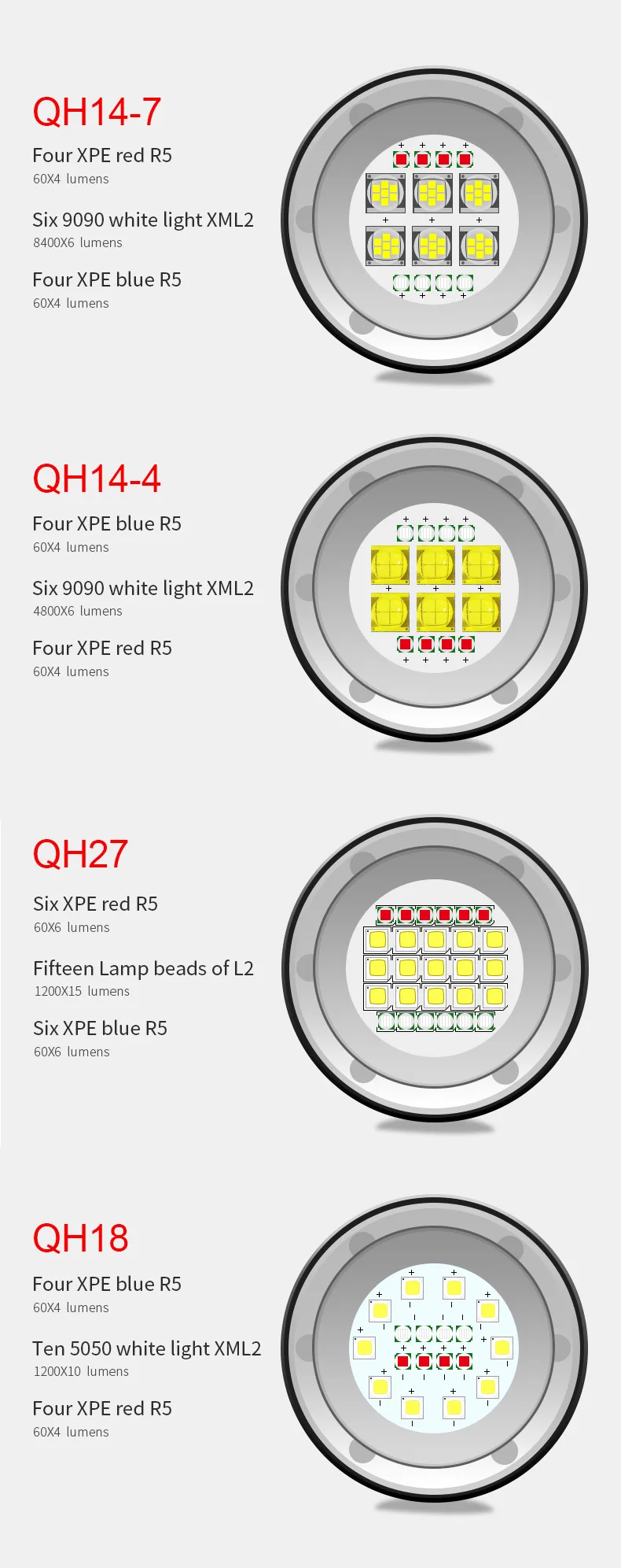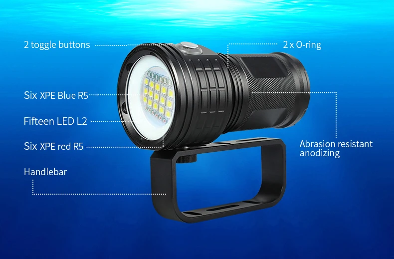 Светильник источник характеристики: 6 шт. 9090 белый светильник 7 * XML2, 4 шт. XPE красный R5, 4 шт. XPE синий R5Белый светильник: высокий, средний, низкий, длительное нажатие в течение двух секунд для выключенияКрасные и синие шестерни: Красный светильник, красная вспышка, синий светильник, двойной щелчок красный светильник, длительное нажатие в течение двух секунд, чтобы закрытьОбъектив изделия: 6 мм двойное покрытие и твердое стекло из поликарбонатаСветильник Тип чашки: неотражающая чашка, светильник с плоской поверхностьюМатериал изделия: авиационный алюминиевый сплавБелый светильник Цветовая температура: 6000KКрасный светильник Длина волны: 620 нмСиний светильник Длина волны: 455 нмУгол луча: 120 градусовВодонепроницаемость: IPX8Тип переключателя: кнопочный переключатель держателя лампыОбработка поверхности: трёхуровневое твердое анодированиеЯркость освещения: 6 9090 ламповых бусин/8400*6 люменовЯркость освещения: 4 синий R5/4*60 люменЯркость освещения: 4 красных R5/4*60 люменовАссортимент продукции: 300-500 метровСпецификация батареи: 4 секции 18650 (2600 мАч)Рабочее напряжение: 3,7 VЦвет изделия: черныйВес нетто продукта: 456 гВодонепроницаемость: 80 метров под водой