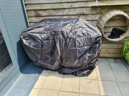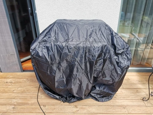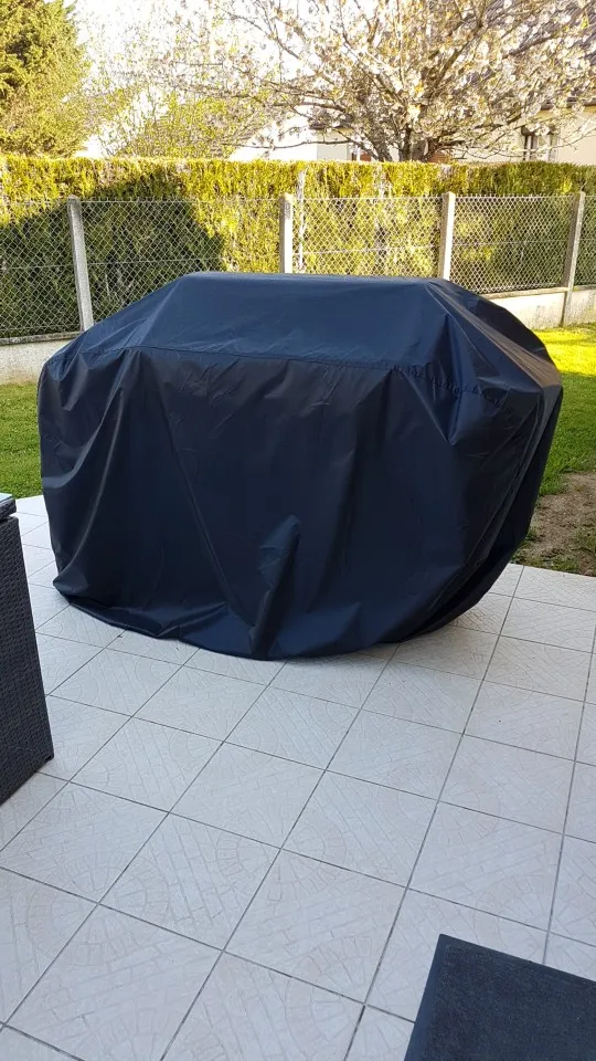 Чехол для барбекю идеально подходит для моего барбекю. Ткань мягкая и напоминает ткань дождевого костюма или туристической палатки. Канатные блоки с танкой.
