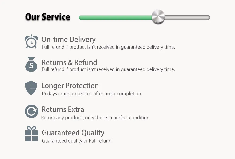 1. На все наши товары действует Гарантия 18 месяцев2. Мы отправим товар в течение 48 часов после оплаты3. Если вы получили товар с какой-либо проблемой, пожалуйста, свяжитесь с нами для послепродажного обслуживания