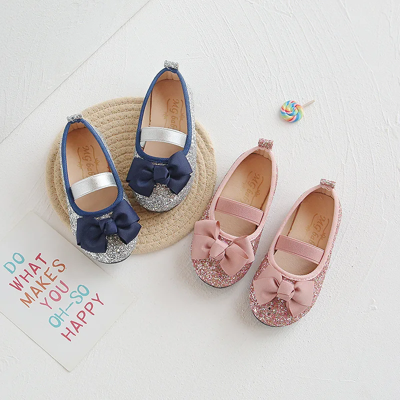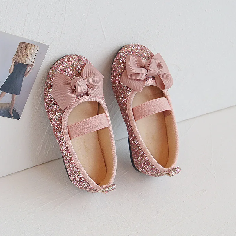 Туфли принцессы Детские с блестками, модная обувь на плоской подошве, с бантиком, детские туфли без каблука, однотонные, для малышей, весна