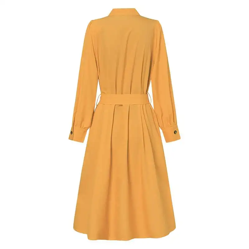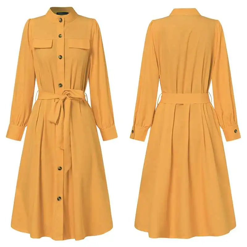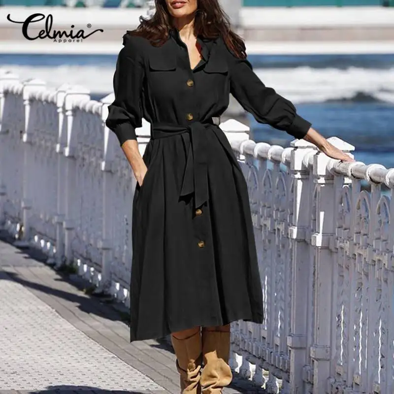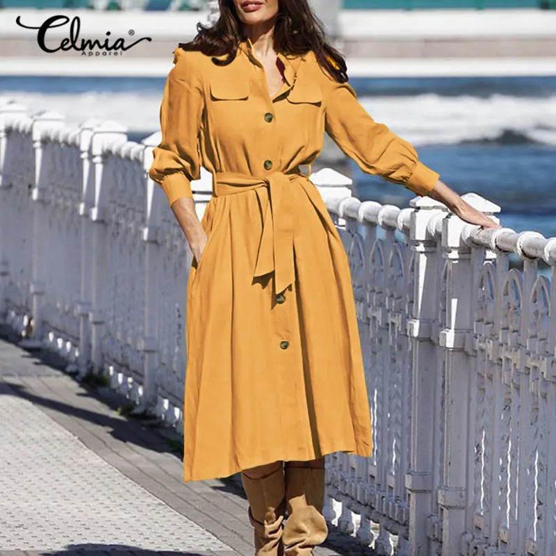 2021 Celmia женское элегантное офисное платье средней длины с длинным рукавом, модное повседневное однотонное платье на пуговицах с воротником-стойкой и поясом, рабочие платья