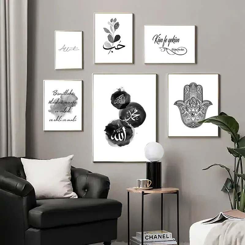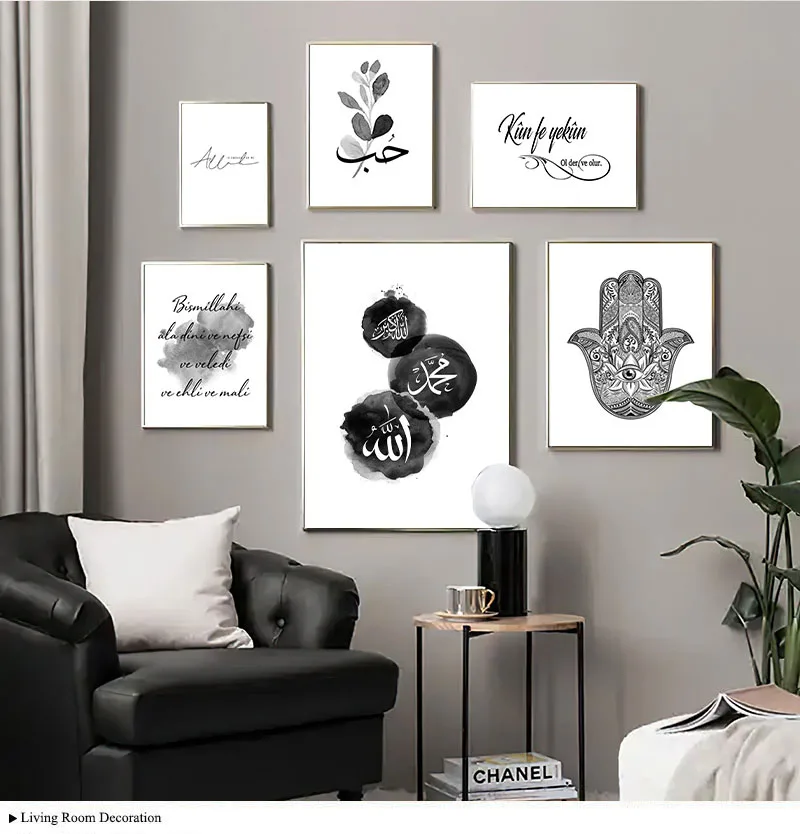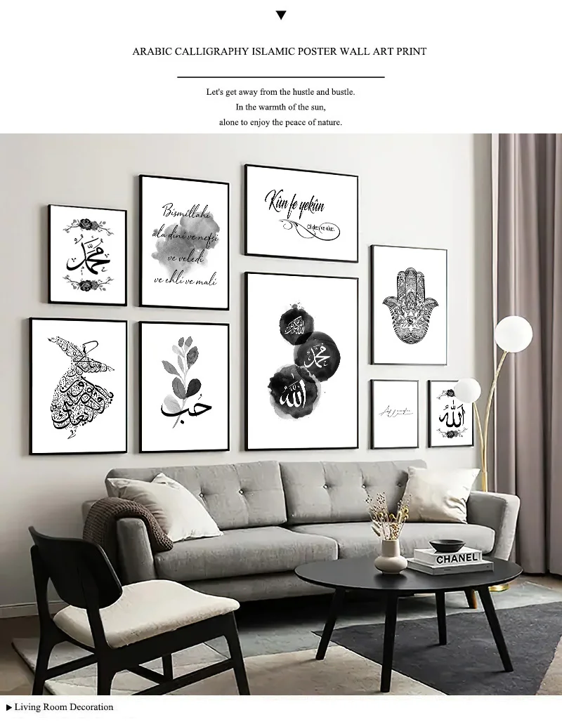 Черно-белые исламские цитаты, Картина на холсте, арабская каллиграф...