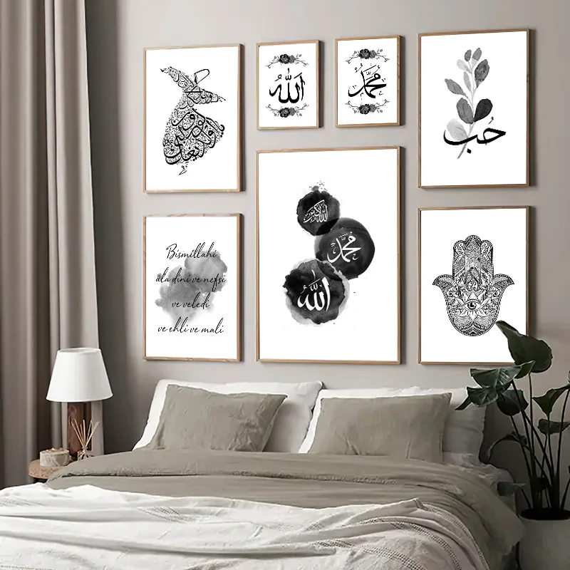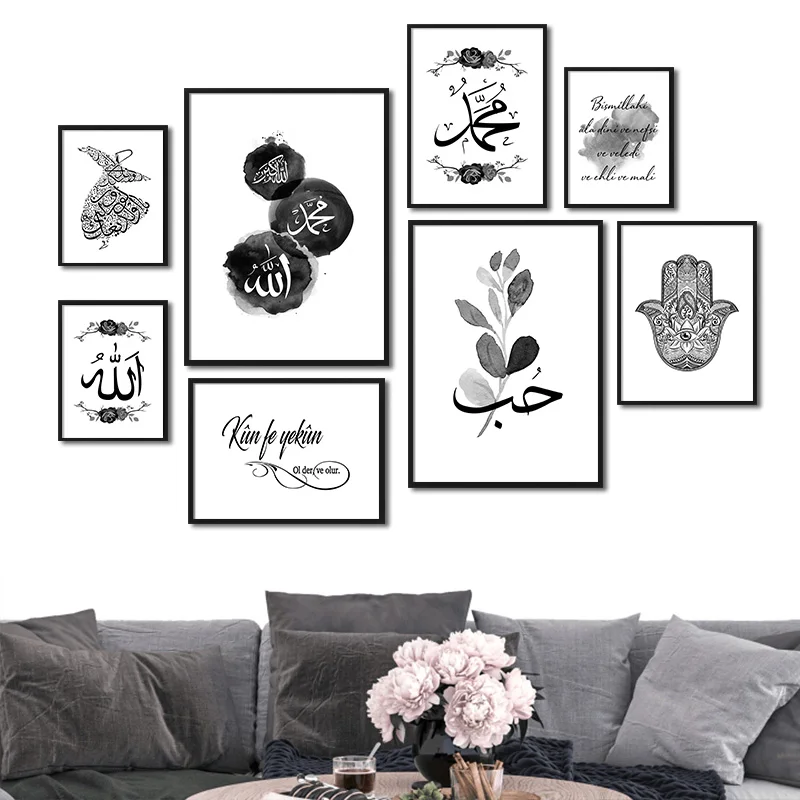 Allah исламское искусство стены холст Постер Черный Белый перо печа...