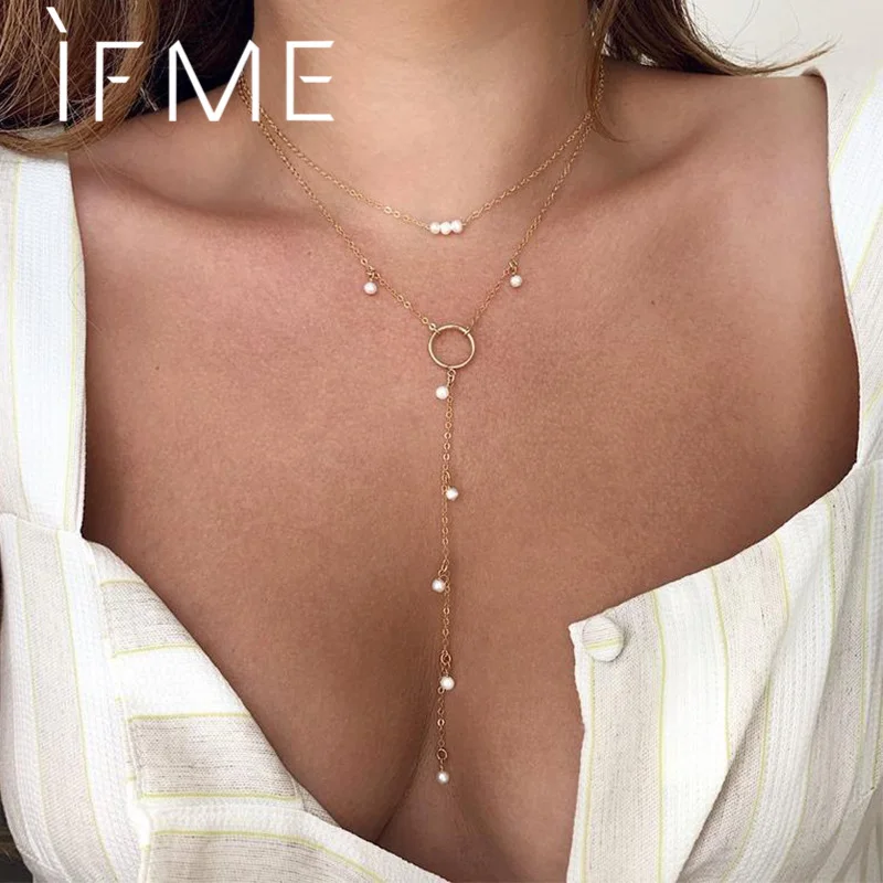 Женское винтажное ожерелье IF ME, многослойная длинная цепочка с жемчугом, чокер золотистого цвета в стиле бохо, ожерелье модные украшения