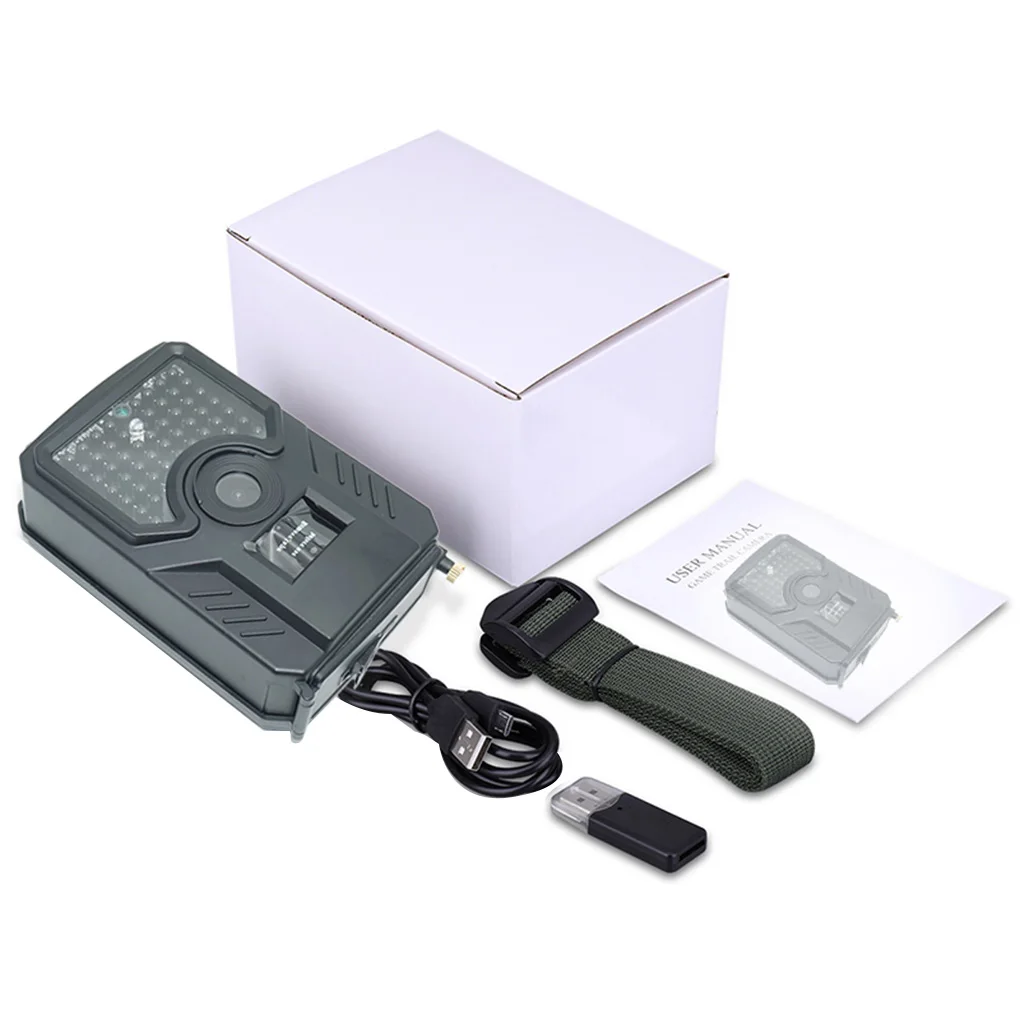 Посылка включает:1 * охотничья камера.1 * ремень.1 * USB кабель.1 * руководство.1 * кард-ридер.