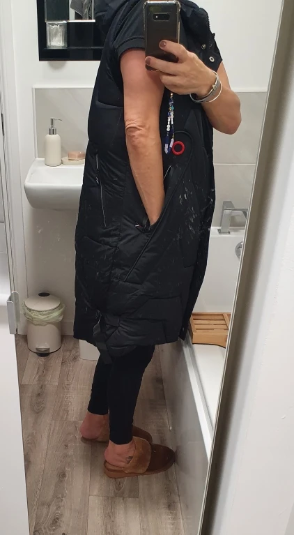 Жилеткой очень довольна! Качество отличное, наполнение отличное, все прошито ровно и качественно.Сзади карманы обманки в виде молний, увидела толко вживую, когда жилет пришел, на фото даже не обратила внимание,что они есть, впереди очень глубокие карманы на молнии.Единственный минус для меня, это то, что жилет застегивается на молнию и кнопка сверху и внизу, а в середине нет, из за этого немного топорщится планка в середине, приходится ее приглаживать рукой.А в остальном все супер, берите не пожалеете.Мой рост 167, обьем груди 102, взяла размер 3XL.Сидит отлично, можно вниз одеть еще теплую толстовку.