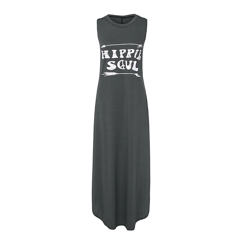 Женское длинное платье без рукавов, с круглым вырезом и буквенным принтом в стиле бохо