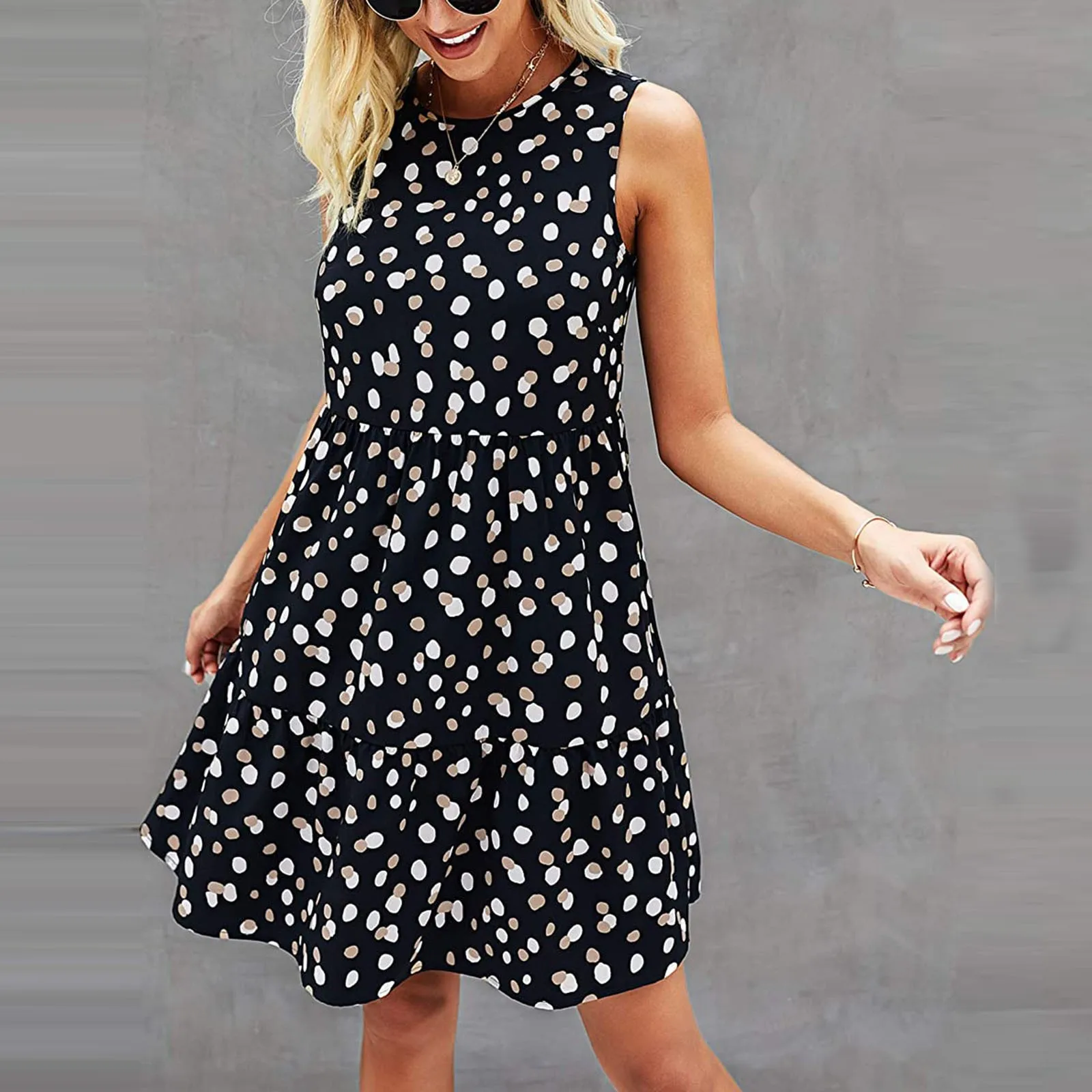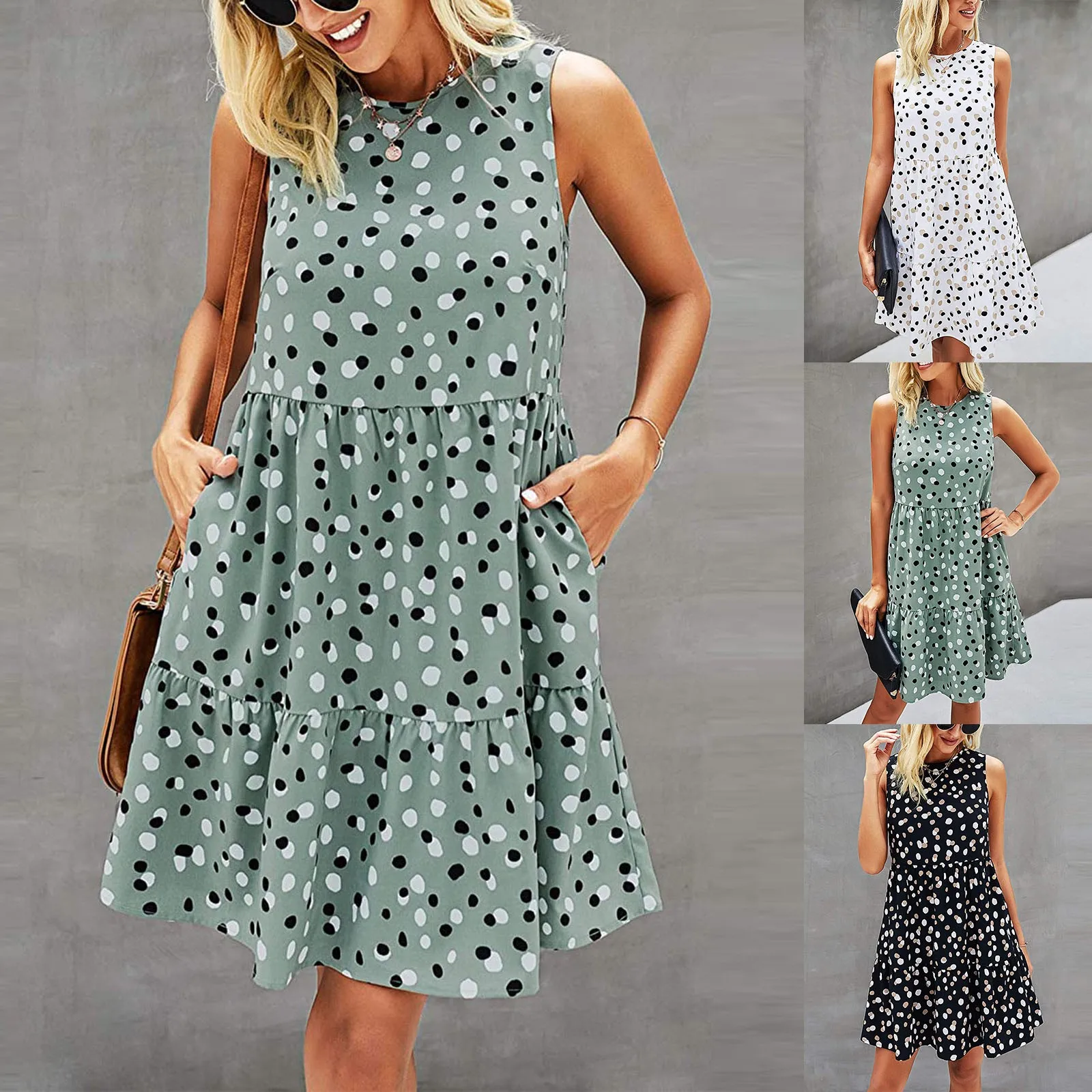 Женское летнее свободное мини-платье, в горошек, с круглым вырезом, без рукавов, с карманами