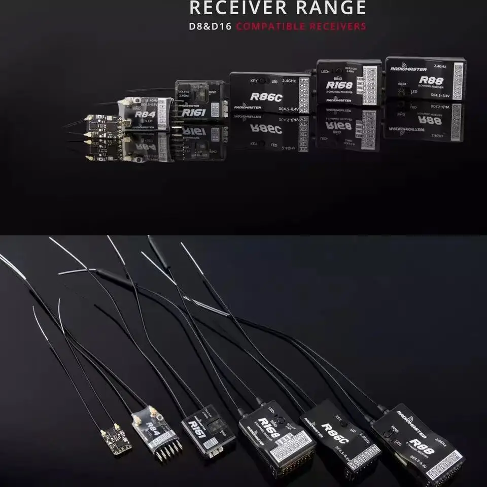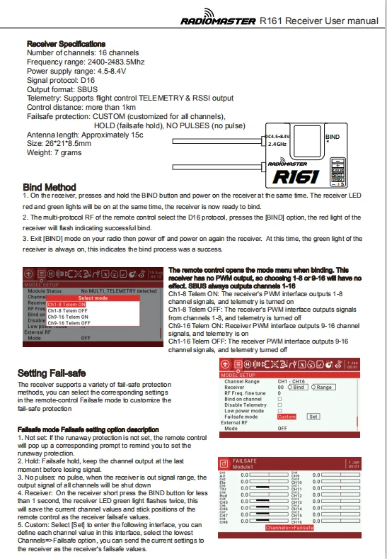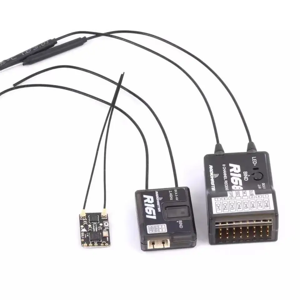 R161 D16Особенности продуктаКоличество каналов: 16 каналовЧастотный диапазон: 2400-2483,5 МГцМощность поставить диапазон: 4,5-6VФормат сигнала: D16Формат вывода: sBUSПоддержка возврата: Полет поддержки управления телеметрией. Выход RSSIРасстояние управления: более 1 кмЗащита от контроля: таможня/удержание/отсутствие импульсовДлина антенны: около 15 смДюйм: 26*21*8,5 мм.Количество: 7 гR168 D16Особенности продуктаКоличество каналов: 16 каналовЧастотный диапазон: 2400 2483,5 МГцФормат сигнала: D16Мощность поставить диапазон: 4,5-6VТип выходной фазы: ШИМ. SBUSПоддержка возврата: Поддержка телеметрии управления полетом. Выход RSSI, VBAT (Обнаружение напряжения до 18 в)Расстояние управления: более 1 кмЗащита от контроля: таможня/удержание/отсутствие импульсовДлина антенны: около 15 смРазмер: 40*26*16 ммВес: 10 г