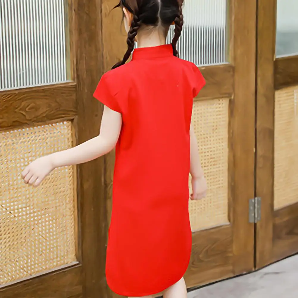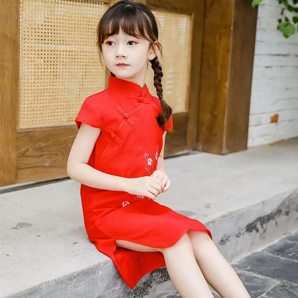 Платье Чонсам с короткими рукавами для девочек, традиционное Хлопковое платье с вышивкой в китайском стиле на новый год для девочек, костюм Тан, детские костюмы
