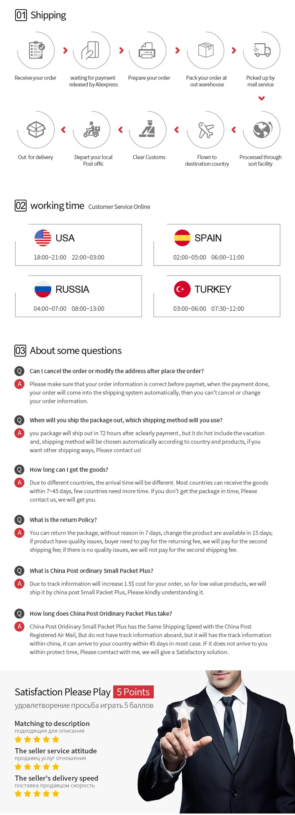 6. Отзывы: если вы удовлетворены нашей продукцией, пожалуйста, дайте мне хорошие отзывы и 5 звезд, спасибо. Если вы не удовлетворены нашей продукцией, пожалуйста, свяжитесь с нами, скажите, в чем проблема, мы поможем вам решить проблему. Потому что наша цель: 100% Удовлетворенность клиентов.