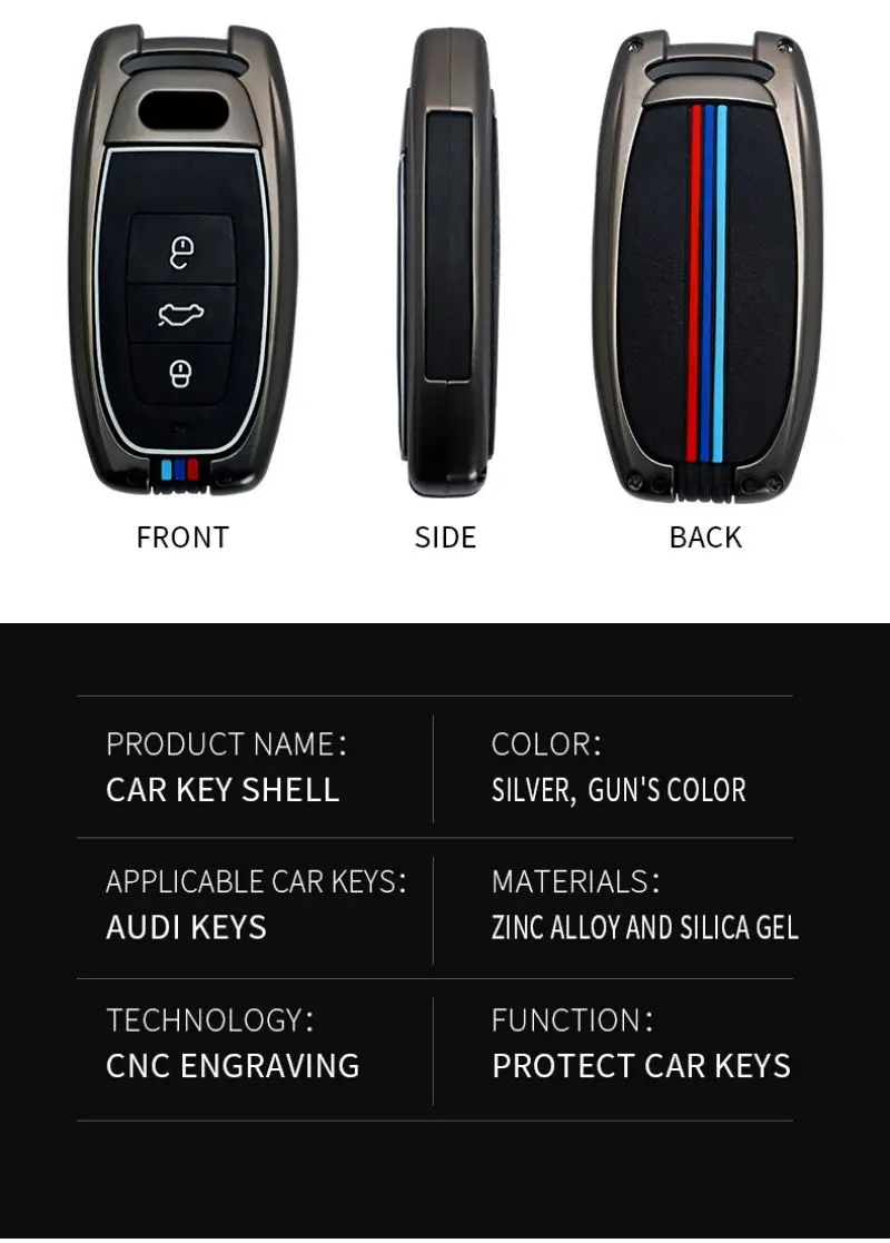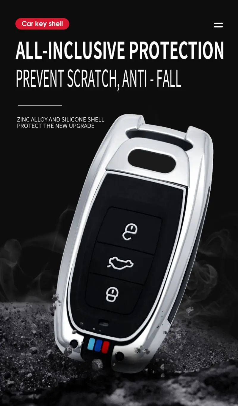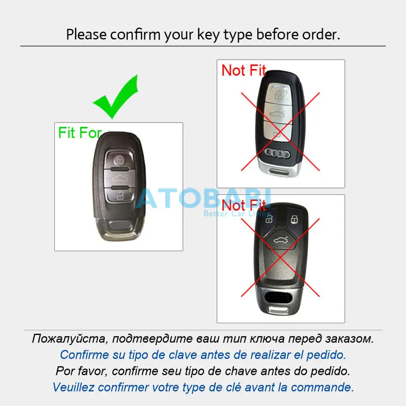 ATOBABI цинковый сплав с силиконовый чехол для ключей от машины умный протектор для пульта дистанционного управления чехол для ключей для Audi A4 A4L A6L Q5 A5 A7 A8 S5 S7 автомобильные аксессуары Характеристики и характеристики: 1. Бренд: ATOBABI 2. Материал: цинковый сплав и силикон 3. Кнопки: 3 4. Отличное соответствие размеру ключа и точному положению кнопки. 5. Защитите ваши автомобильные ключи от повреждений и царапин. 6. Чехол для ключей имеет светящийся эффект. 7. Хорошее прикосновение и простота установки. Совместимость с моделями: Подходит для Audi A4 A4L A6L Q5 A5 A7 A8 S5 S7 и т. Д. (Примечание: Совместимость только для справки, пожалуйста, сравните изображение с ключом автомобиля перед покупкой.) Посылка включает: Чехол для автомобильного ключа-1 шт. 1 х кольцо для ключей (Брелок для автомобильного ключа в комплект не входит.)