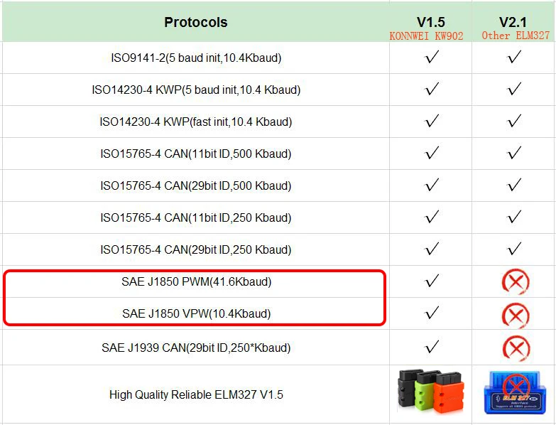 A2: наш новейший KW902 ELM327-100% V1.5, который поддерживает полную версию протоколов (10 протоколов), особенно протоколы J1850 и J1939 для японских автомобилей и американских автомобилей, другие elm327 только 7 или 9 протоколов.