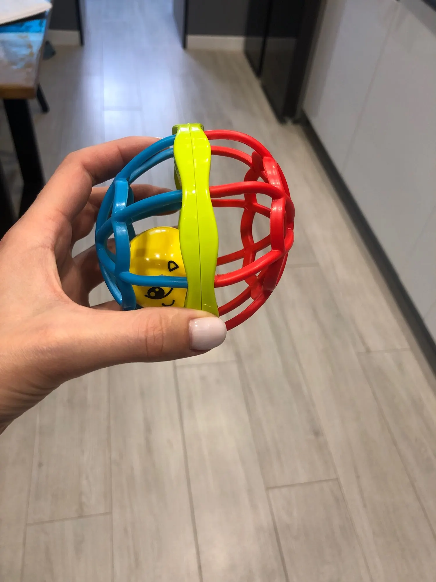 Товар приехал за 2 недели вместе с другими заказами в одной отслеживаемой посылке. Забрала на почте. Все было целое. Приятная игрушка, ребёнка заинтересовала. Немного не аккуратно прорезаны дыры в резиновой мягкой части, но это мелочи. Запаха не было, все было чистое. Игрушка бренчит.