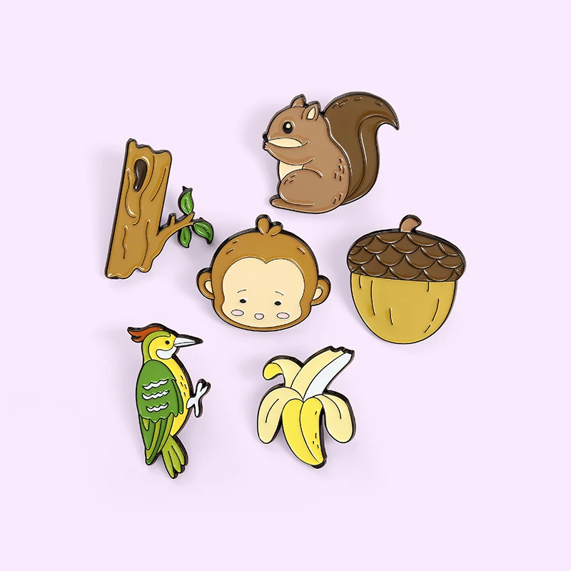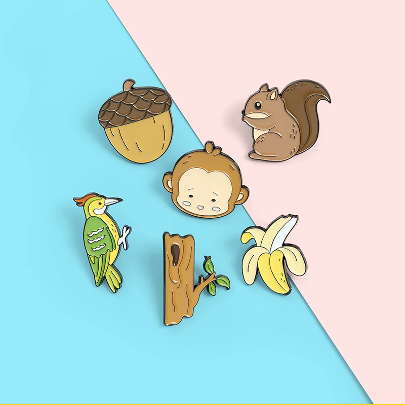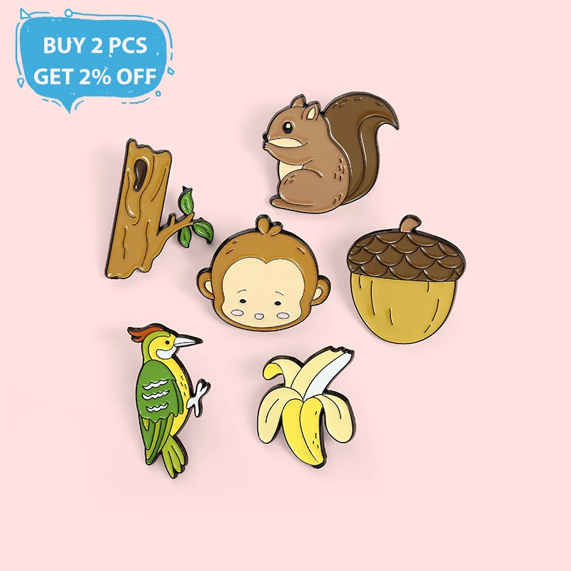 Броши на лацкан с эмалью, 6 видов, лесные животные, Лесной дятл, белка, обезьяна, орехи, банан, значки дерево