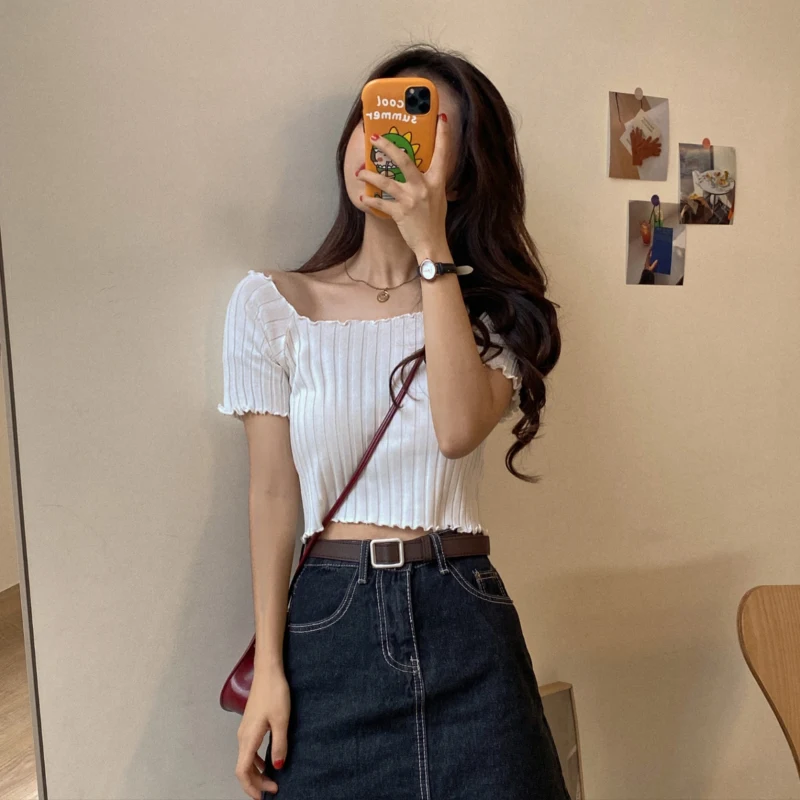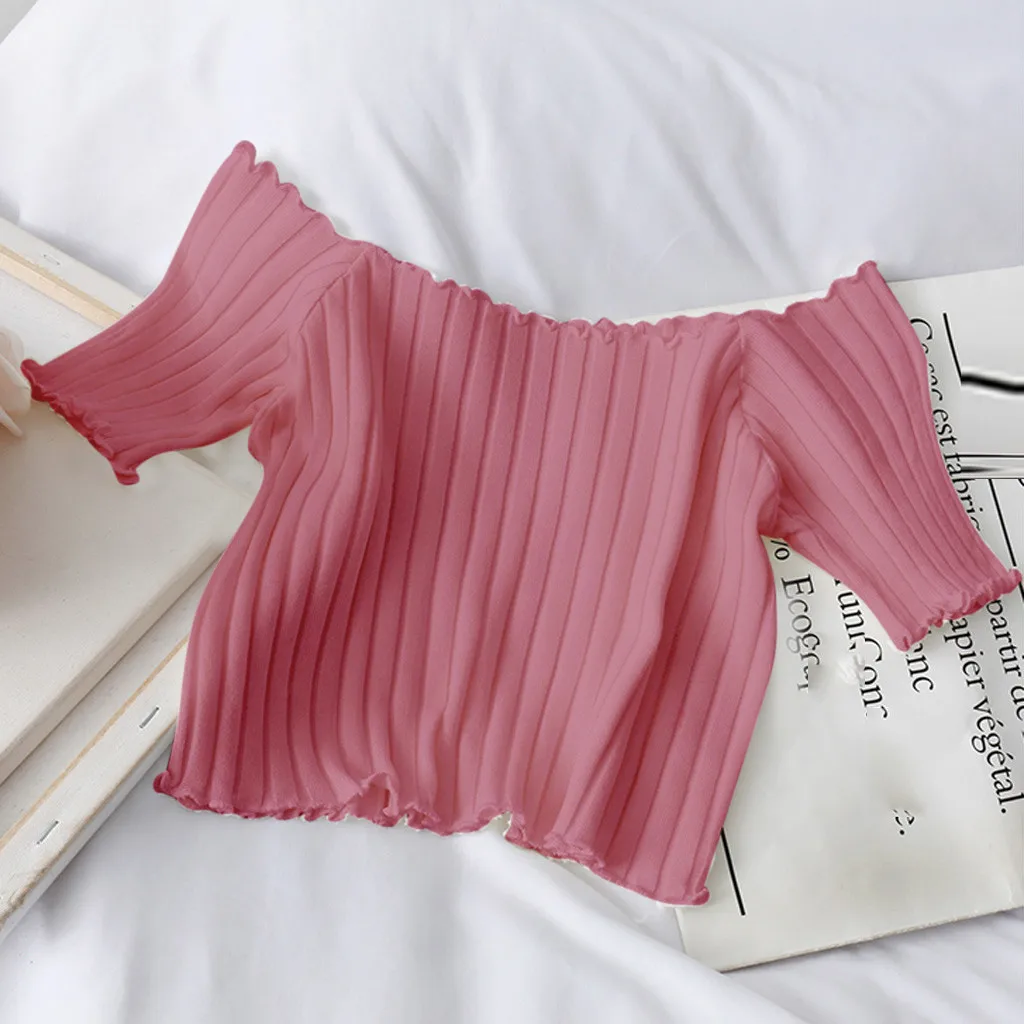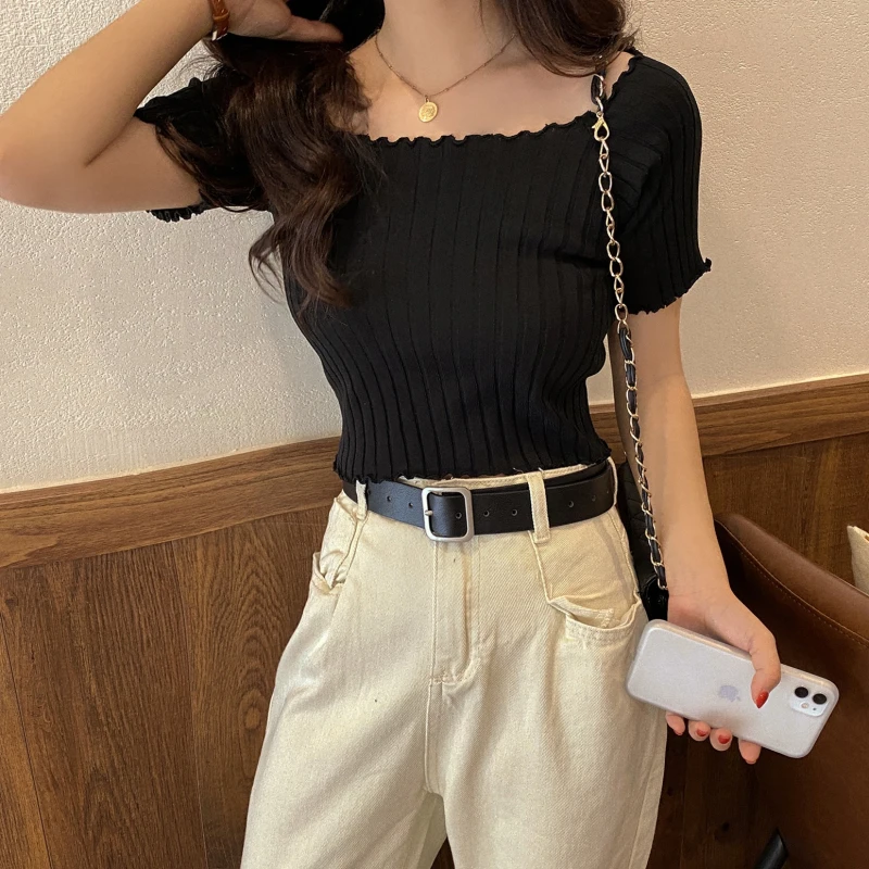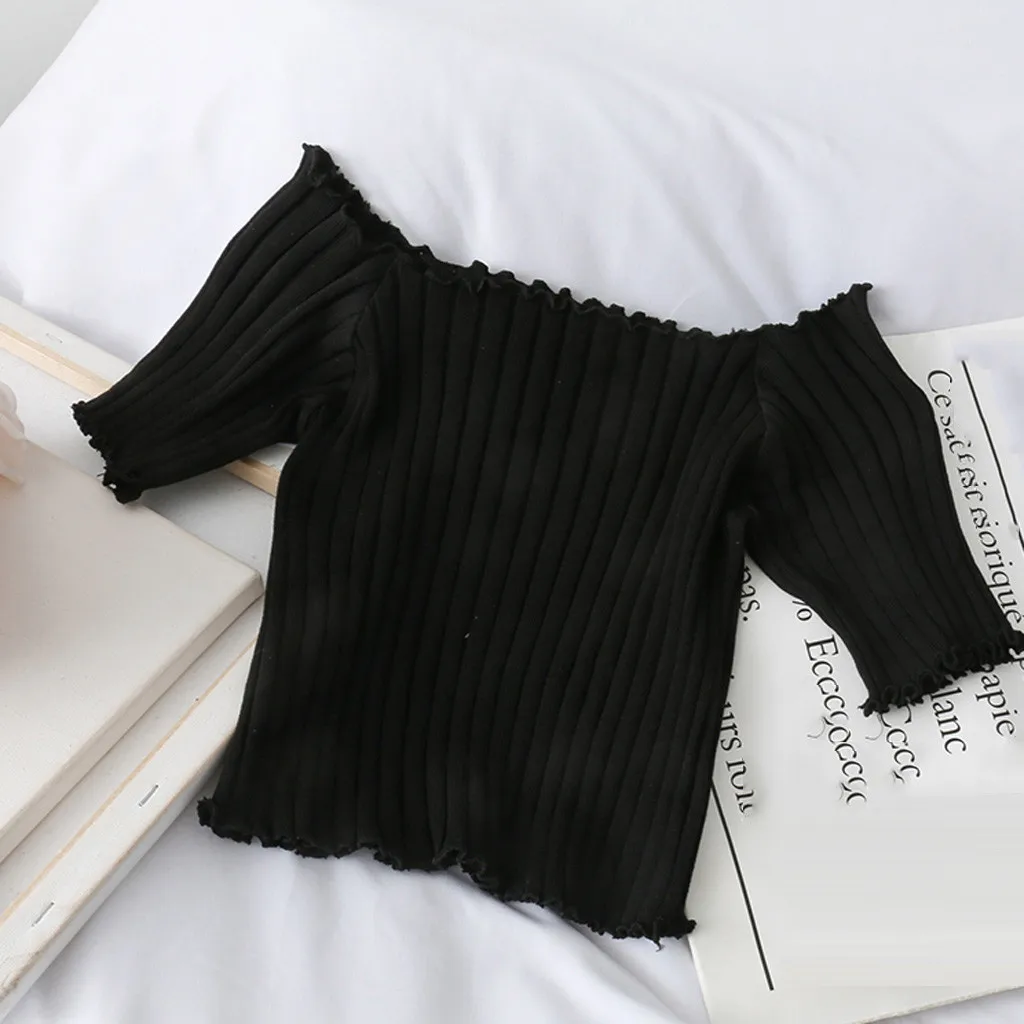 Женский трикотажный топ с открытыми плечами, Однотонная футболка в полоску с коротким рукавом и оборками на подоле