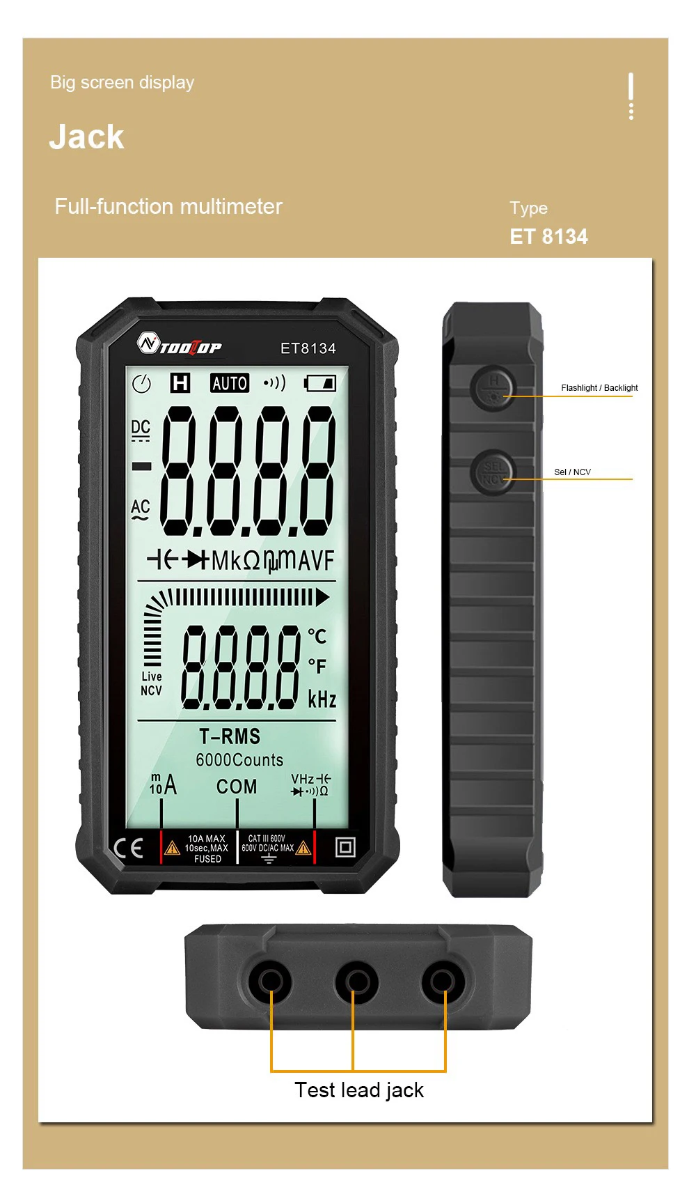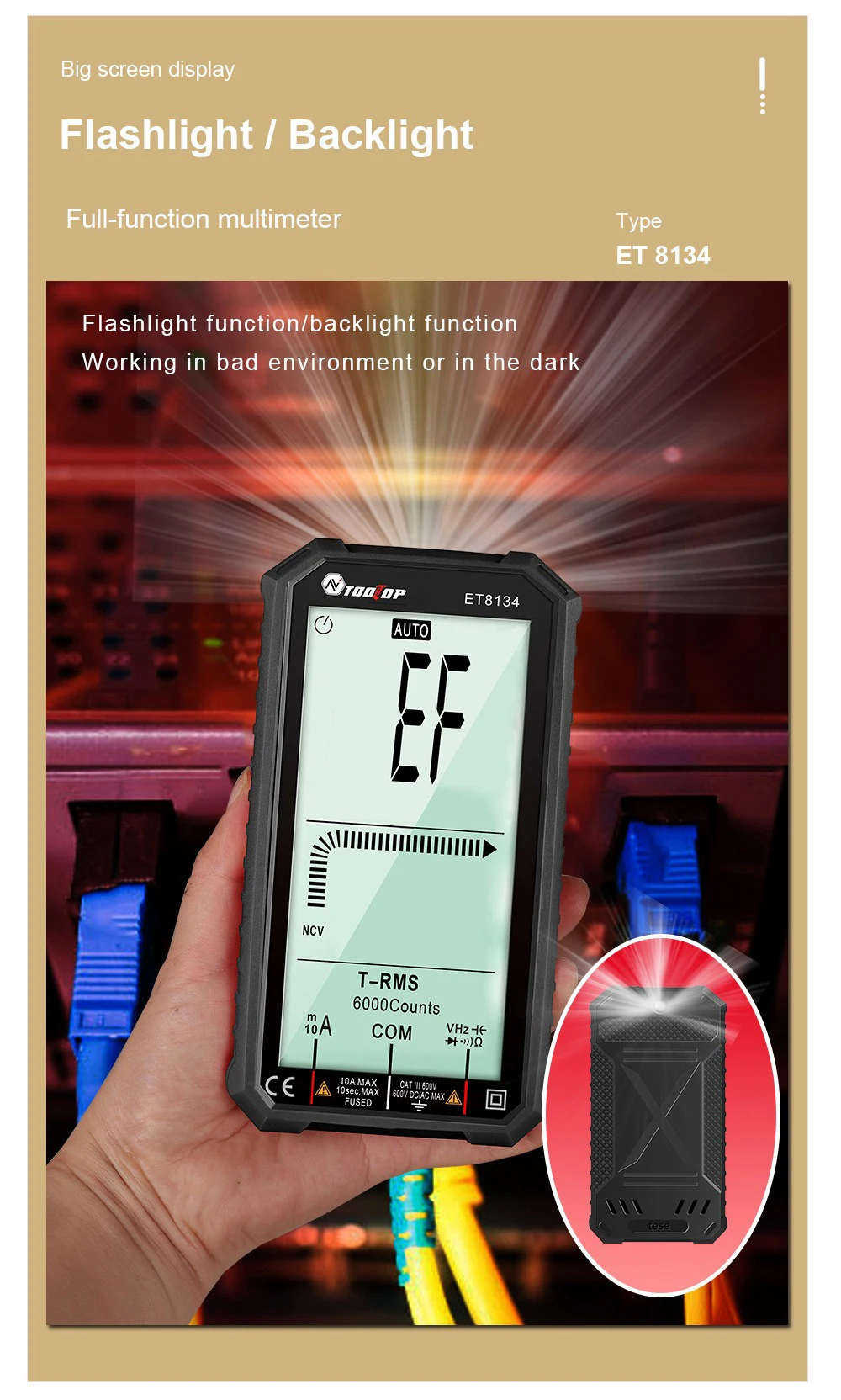 Цифровой мультиметр ET8134 NCV, ЖК-дисплей, подсветка, Автоматическ...