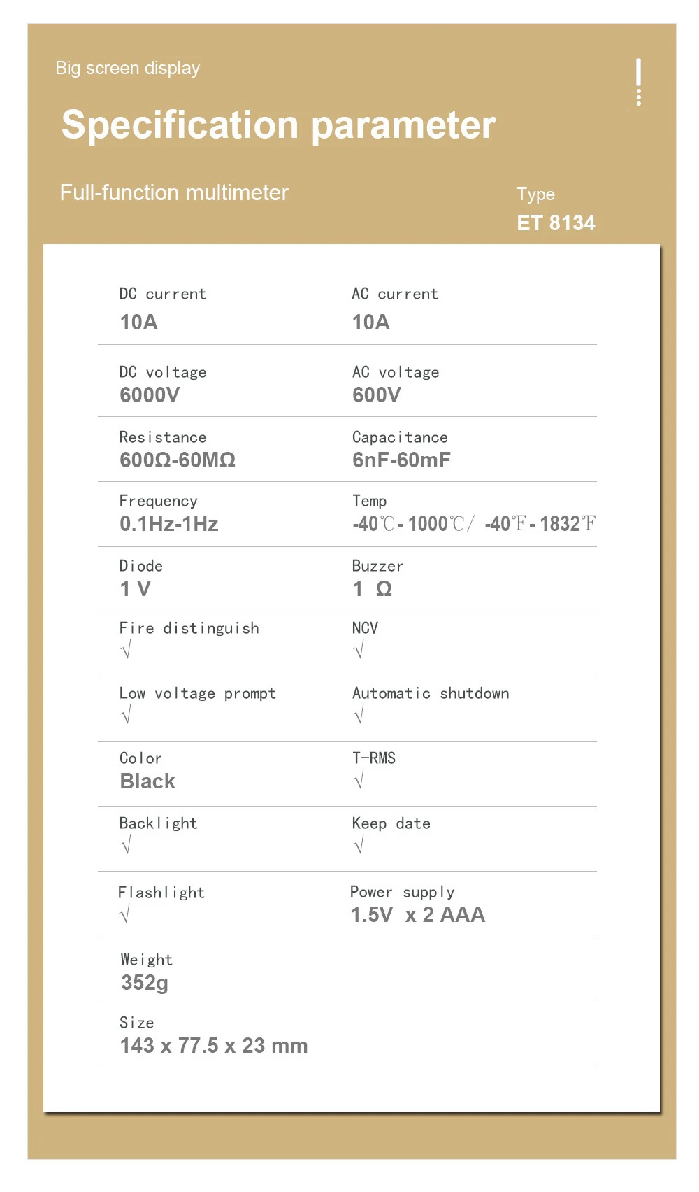 Цифровой мультиметр ET8134, 4,7 дюйма, ЖК-дисплей, Измеритель посто...