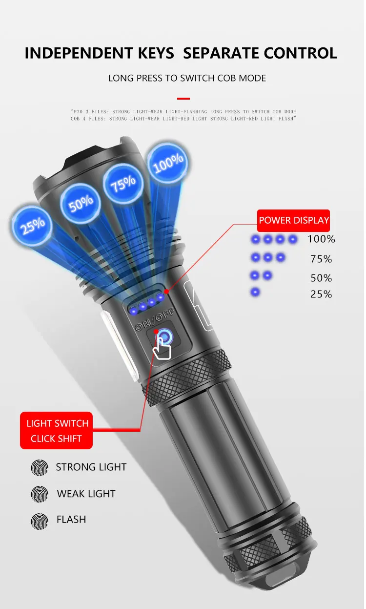 Высокий люмен P99 + Ближний свет COB красный и белый светильник, богатый функциями, подходит для наружного высокоточного дизайна зарядного порта, чтобы устранить проблему кривого зарядного порта, утолщенный водонепроницаемый штекер, поверхностная жесткая окисленная обработка, износостойкая, не легко царапается, и высокое качество на ощупь