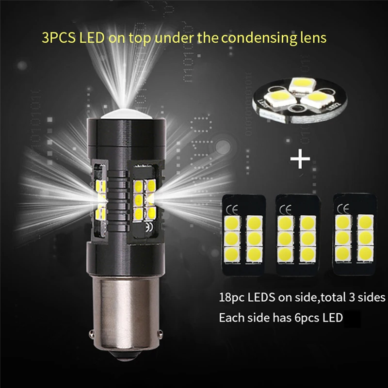Характеристики:Напряжение 12V- 24VМощность: 4,08 ВтЭлектрический ток: 0.36AТип разъема: (1156-P21W-BA15S) (1157-P21/5W-BAY15D) (1156-PY21W-BAU15S)Светильник: 21*3030 SMDСупер яркость: 1000 лмУгол освещения: 360 градусовСрок службы:> 50000 рабочих часов