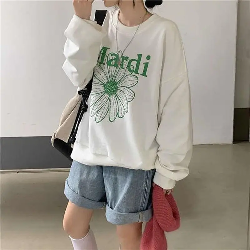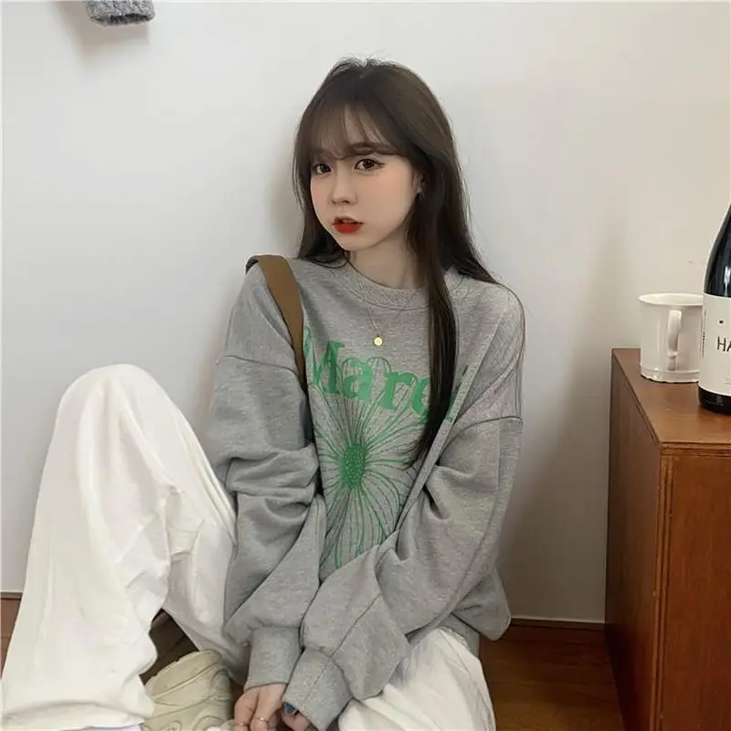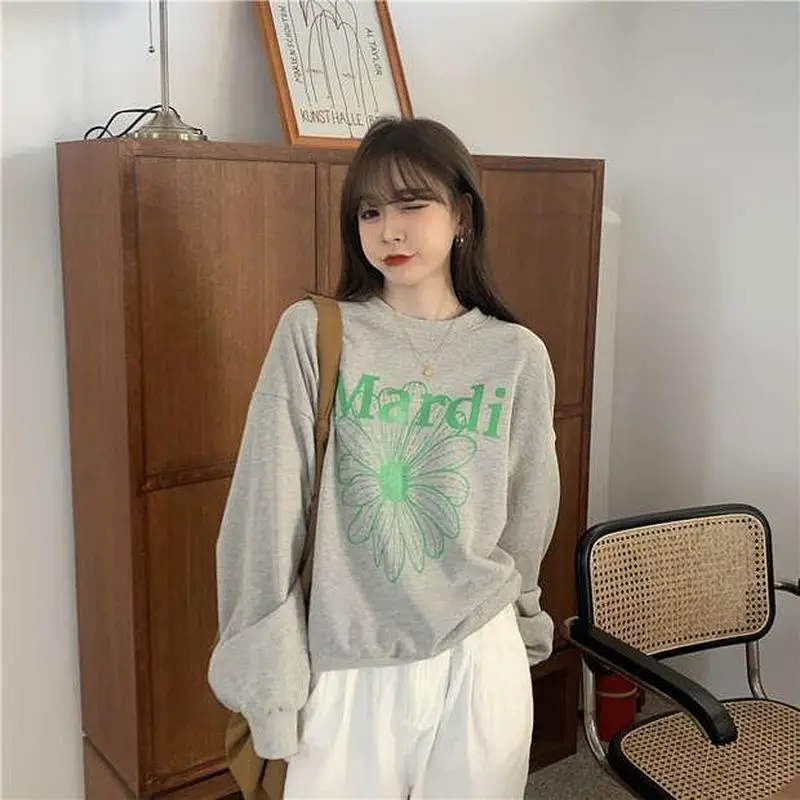 Свитшот женский с круглым вырезом, Свободный пуловер в Корейском стиле с длинным рукавом и принтом, Молодежная куртка бойфренда для осени и весны