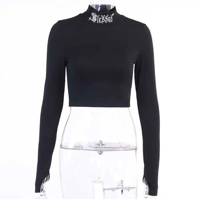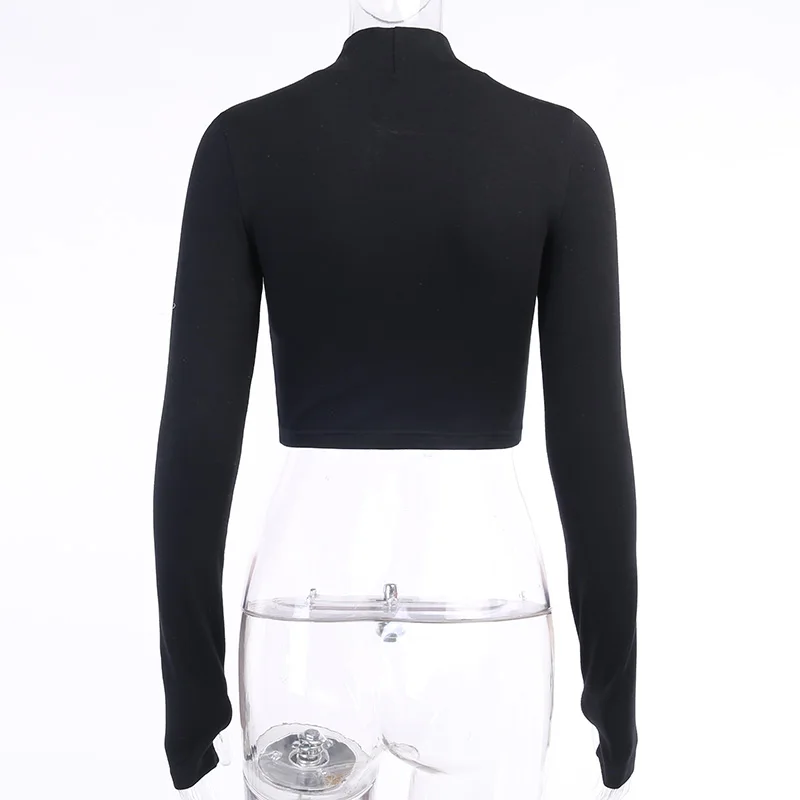 Женский короткий топ с длинным рукавом, черный однотонный топ с выш...