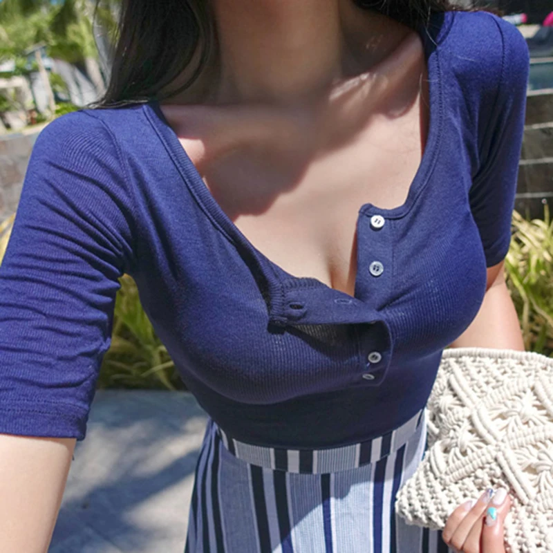 Женская короткая футболка на пуговицах, облегающая дышащая эластичная футболка с V-образным вырезом и открытыми пуговицами, лето 2022