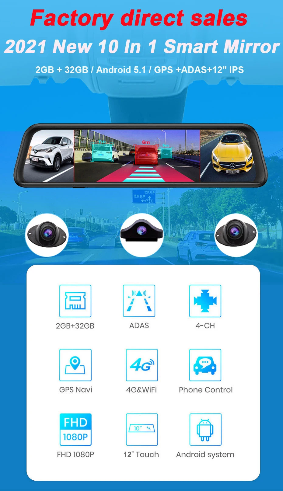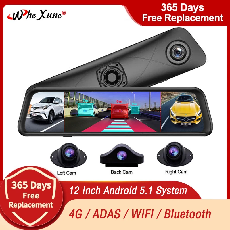 Видеорегистратор, 12 дюймов, IPS Full HD 1080P, Android 5,1, 4 канала, WIFI, Автомобильный видеорегистратор, камера для авто, 4G, ADAS, GPS-навигация, видеорегистратор