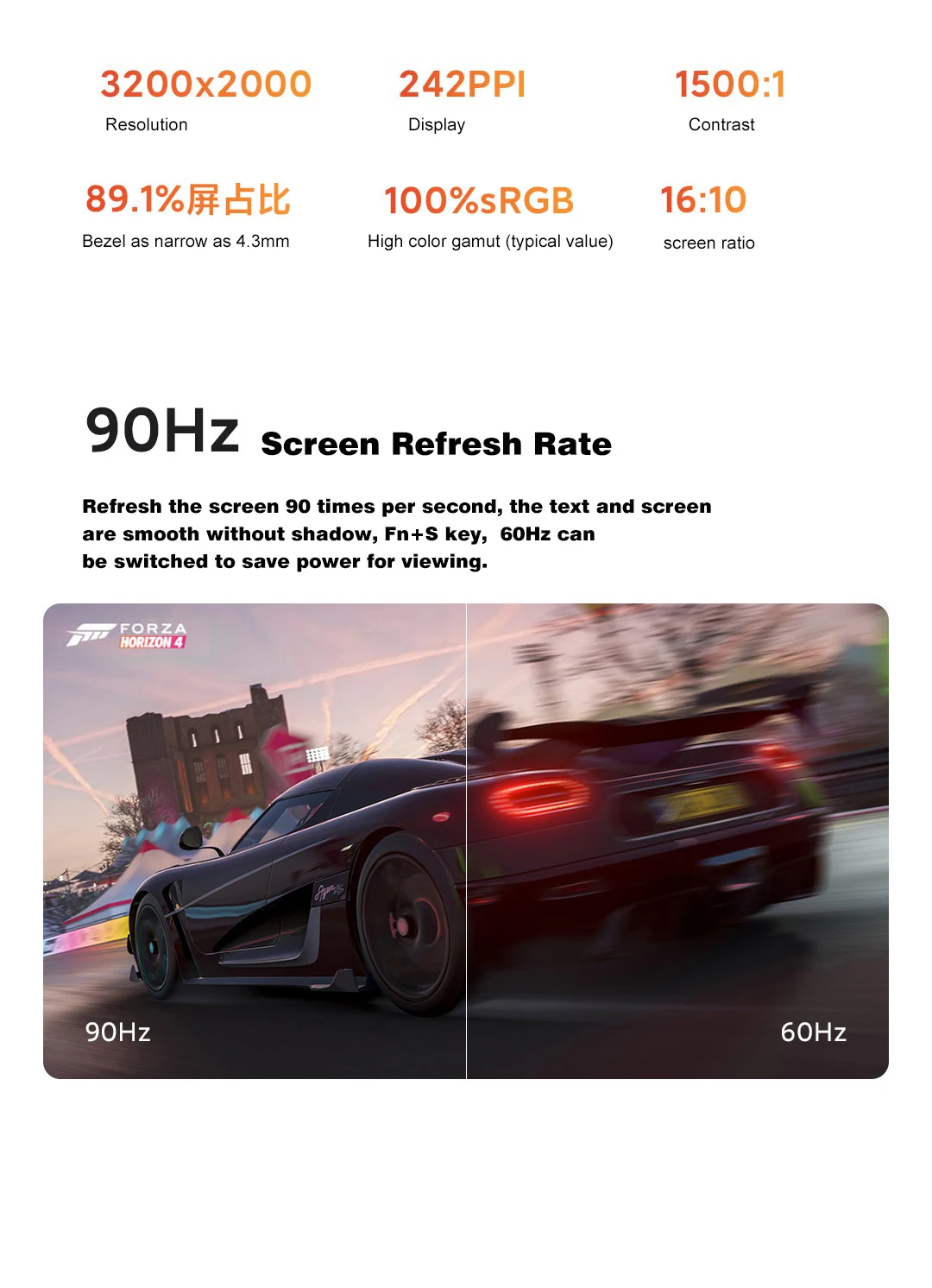 15,6 "супер Retina полный ЭкранРазрешение 3200 × 2000242PPI, 4,3 мм узкий ободок *, 89.1% соотношение между экраном и корпусом *,16:10 соотношение дисплея, жесткий экран высокой четкости с антибликовым покрытием, угол обзора 178 °,Яркость 300 нит (типичное значение), коэффициент контрастности 1500:1 (типичное значение),Частота обновления 90 Гц (Заводское значение по умолчанию), FN + S может переключаться между 90 Гц и 60 Гц, 100% цветовая гамма sRGB (типичное значение), поддержка затемнения постоянного тока,Прошел TüV Rheinland Уровень оборудования низкий синий светильник сертификации