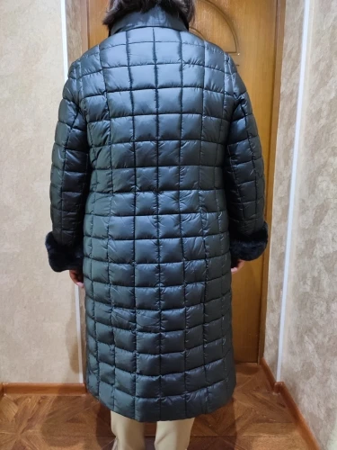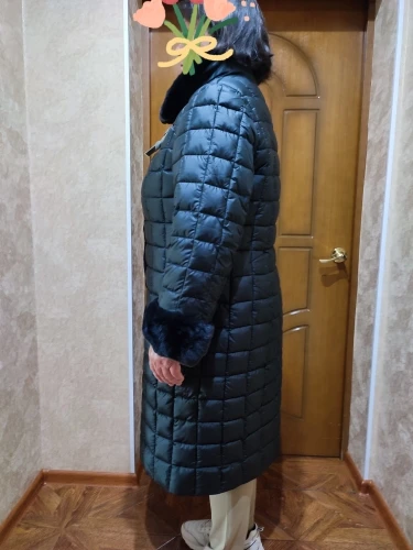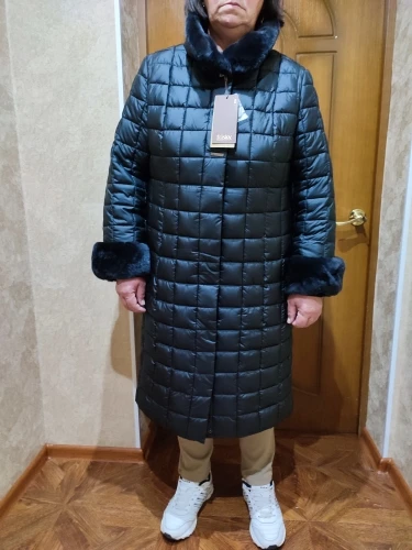 Купила, пальто для мамы. Ее размеры рост 165,обхват руди 118,обхват талии 109,бедер 115.По совету продавца, приобрели 5 ХХЛ. Пальто село по фигуре, Идеально. Сказать что пальто хорошее, это ничего, не сказать. Оно просто великолепное, безупречный пошив, качественная ткань, фурнитура. Добротный мех на воротнике, манжетах. Пальто очень стройнит. Хороший поклад, внутренний карман. Очень в нем жарко. Буду со временем, делать фото на наших Российских Зимних пейзажах. Вот тогда, уже, точно можно будет, сказать тепло ли в нем. Продавцу спасибо за подарок, платок. Рекомендую к покупке, пальто одето на домашнюю футболку, мама, будет, носить с трикотаж. водолазкой.