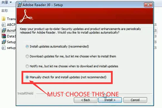 Шаг 1:При установке PDF файла и запуске AcroRead.msi, необходимо нажать последнюю опцию «вручную проверить и установить обновления (не рекомендуется)»(Не выбирайте другие, иначе он потеряет авторизацию, устройство повреждено)