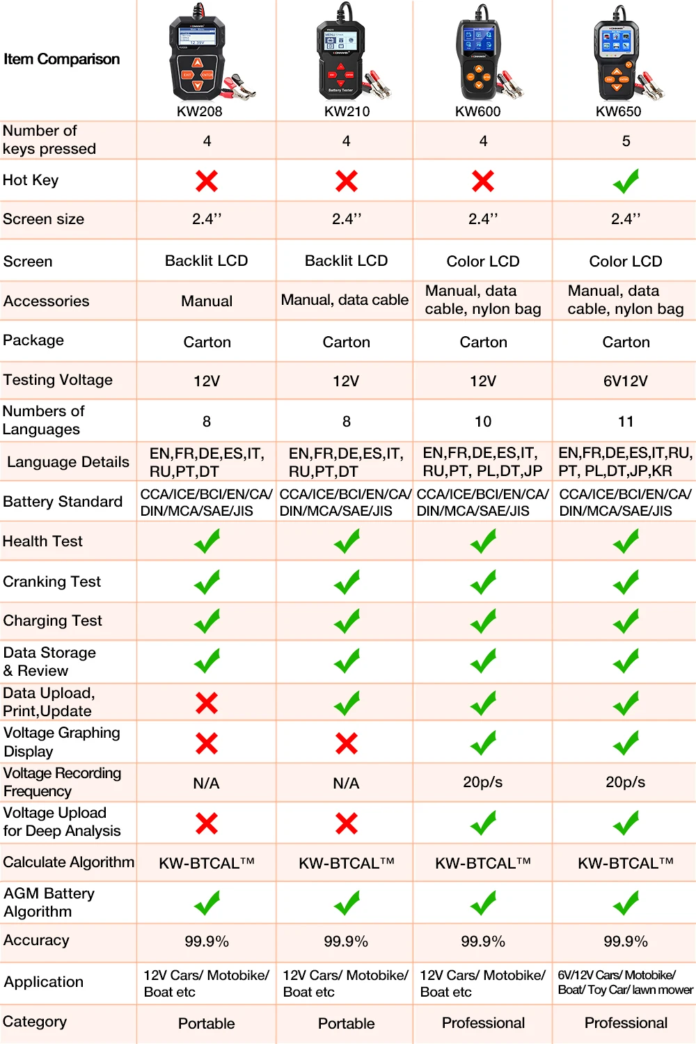 KW208 тестер батареи * 1Руководство по эксплуатации * 1Безопасная упаковочная коробка * 1