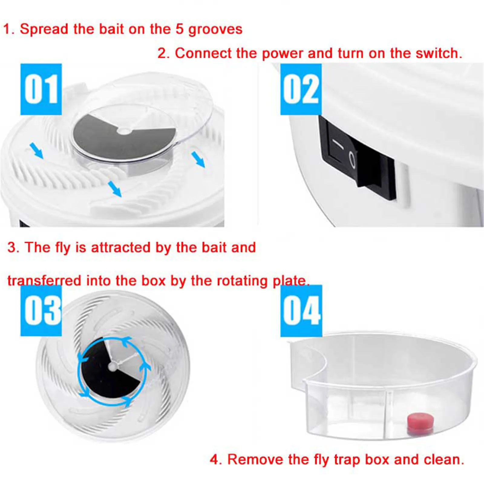 Usb-кабель, безопасный и удобный. Можно использовать повторно, высокая стоимость. Физические ловушки, безопасные и дружелюбные. Высокая эффективность захвата. Инструкции: 1. Нанесите приманку на 5 канавок (Не используйте жесткие предметы в качестве приманки). 2. Подключите питание и включите переключатель. 3. Муха притягивается приманкой и переносится в коробку вращающейся пластиной. 4. Снимите ящик для ловушки и очистите. Характеристики: Продукт: Коробка для ловушки Материал: пластик Количество: 1 Цвет: белый