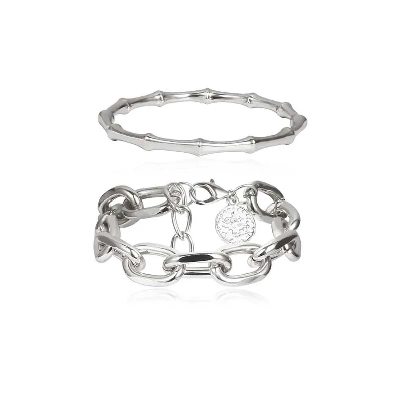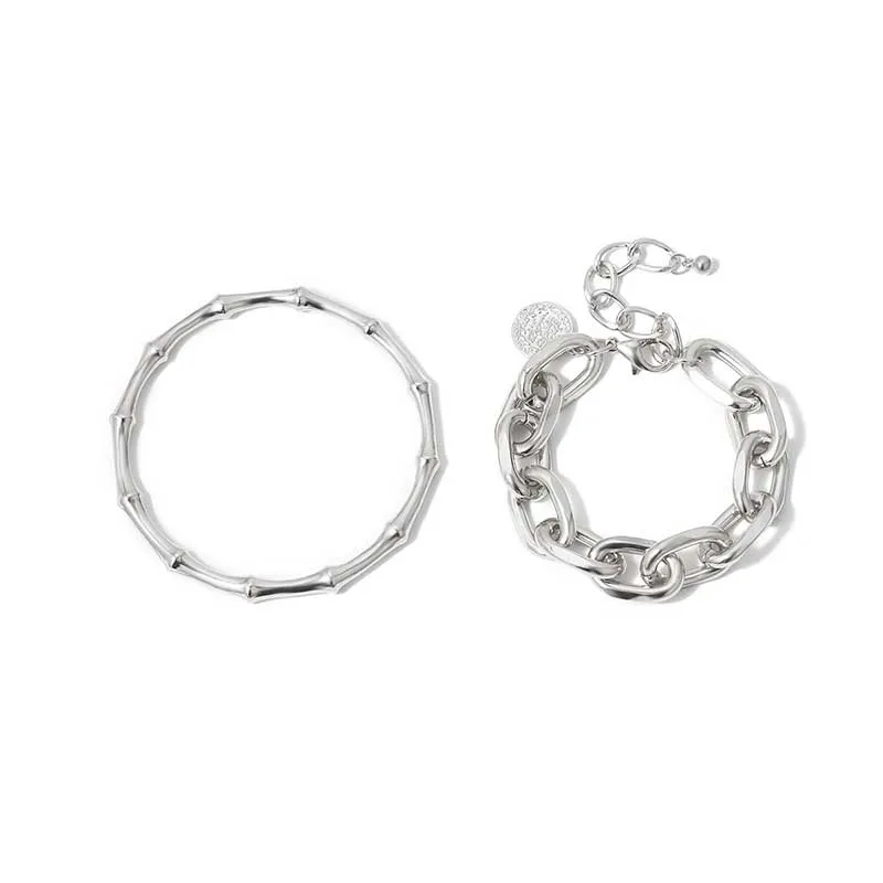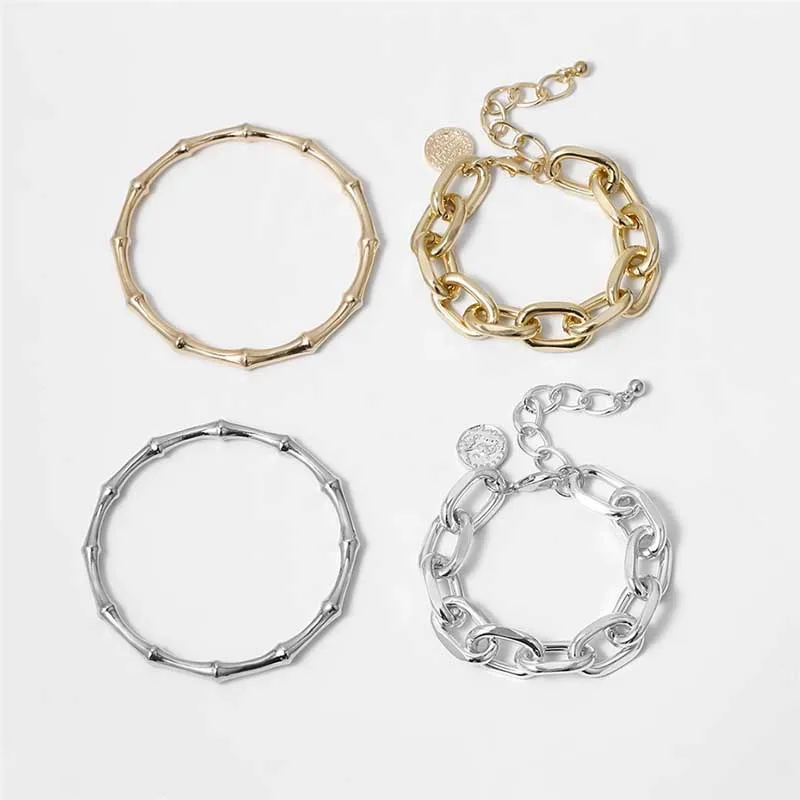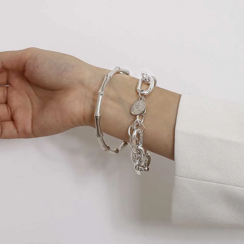 100% новый и высокое качествоСтиль: модный, модный, Повседневный, панк, индивидуальныйТип изделия: металлический браслет из бамбукаМатериал: сплавЦвет: золотой, серебряныйРазмеры: 7,2 см, 17 см + 5 смПовод: Повседневная жизнь, подарок, вечерние, офисныеПосылка включает в себя: 2 шт/1 Набор браслетовПримечание:Из-за того, что светильник и экран компьютера отражаются, истинный цвет может немного отличаться от изображения.