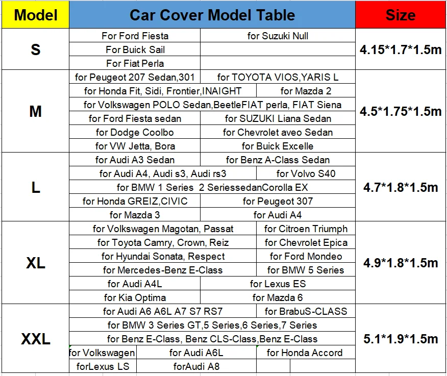 Особенности:Автомобильный чехол может эффективно предотвратить вредные УФ-лучи, грязь, пыль, снег, мороз и т. Д.Изготовлен из высококачественной нейлоновой ткани, более долгий срок службы по сравнению с другими материалами в ту же погоду.Поставляется с 6 флуоресцентными светоотражающими полосками, которые защищают безопасность вашего автомобиля в ночное время.Он эффективно защищает от пыли, сохраняя автомобиль внутри и снаружи чистым и аккуратным.Есть 5 различных размеров автомобильных чехлов, которые вы можете выбрать для удовлетворения различных потребностей.Характеристики:Тип изделия: автомобильные чехлыТип материала: полиэстерЦвет: черныйСовместимый тип автомобиля:Для СеданаРазмер: S, M, L, XL, XXL (необязательно)Особенности: солнцезащитный, пылезащитный, анти-УФ, ТермоЗащита, устойчивость к царапинамРазмер в разложенном виде: 4,50*1,75*1,50 м/14,8*5,7 * футовПосылка: 31*29*5,0 см/12,2*11,4 * 2.0inВес посылка: 1080 гКомплектация:1 * чехол1 * сумка для храненияРазмер и Совместимые модели:S: 4,15*1,7*1,5 мЗамена для форд фиестаЗамена для Suzuki NullЗамена для Buick SailЗамена для Fiat PerlaМ: 4,5*1,75*1,5 мЗамена для Peugeot 207 седан, 301Замена для Honda Fit, Sidi, Frontier,INAIGHTЗамена для Volkswagen POLO Sedan,BeetleFIAT perla, FIAT SienaЗамена для TOYOTA VIOS,YARIS LЗамена для Ford Fiesta седанЗамена для SUZUKI Liana седанЗамена для Chevrolet aveo седанДля Dodge CoolboЗамена для VW Jetta, BoraЗамена для Buick ExcelleЗамена для Мазда 2L: 4,7*1,8*1,5 мЗамена для Audi A3 седанЗамена для Audi A4, Audi s3, Audi rs3Замена для BMW 1 Series 2 SeriessedanCorolla EXЗамена для Benz A-Class седанЗамена для Honda GREIZ,CIVICЗамена для Пежо 307Замена для Volvo S40Замена для Мазда 3Замена для Audi A4XL: 4,9*1,8*1,5 мЗамена для Volkswagen Magotan, PassatЗамена для Toyota Camry, Crown, ReizЗамена для Хундай Соната, респектЗамена для Mercedes-Benz E-ClassЗамена для ситроен ТриумфЗамена для Шевроле ЭпикаЗамена для Ford MondeoЗамена для BMW 5 серииЗамена для Audi A4LЗамена для Lexus ESЗамена Для Киа ОптимаЗамена для мазда 6XXL: 5,1*1,9*1,5 мЗамена для Audi A6 A6L A7 S7 RS7Замена для B-rabuS-классаЗамена для BMW 3 Series GT,5 Series,6 Series,7 SeriesЗамена для Benz E-класс, Benz CLS-класс, Benz E-класс, замена для Honda AccordЗамена для VolkswagenЗамена для Audi A6LЗамена для Lexus LSЗамена для Audi A8