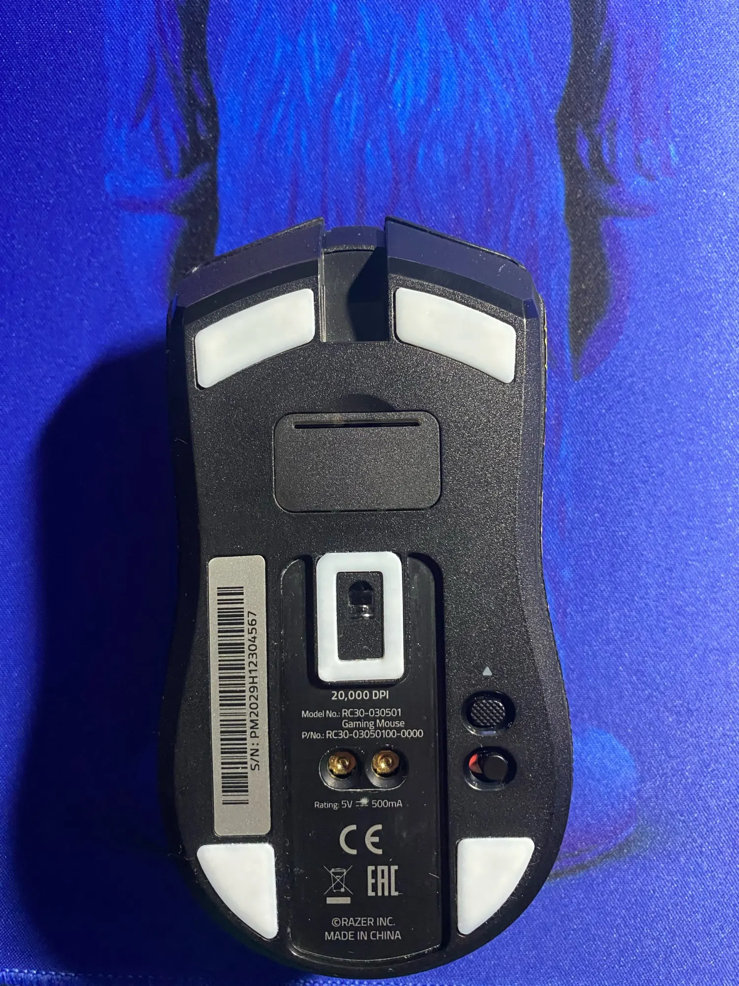 Сняв прозрачную защитную пленку на ножках мыши, аккуратно выровняйте паз для ног на нижней оболочке мыши, затем слегка надавите на ногу.