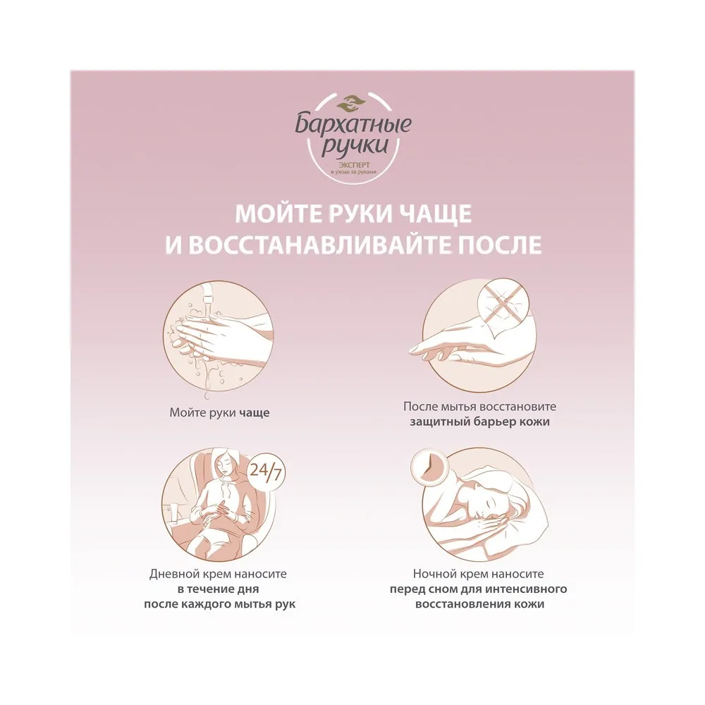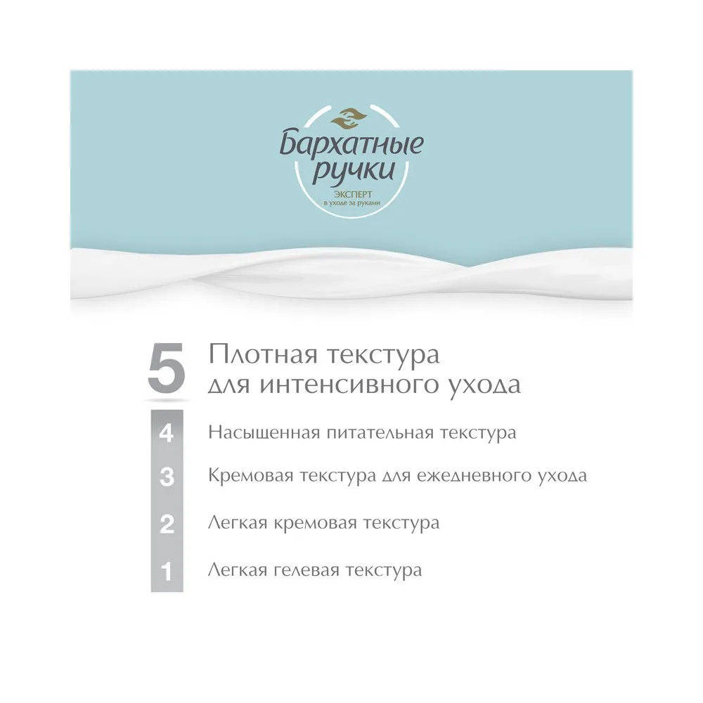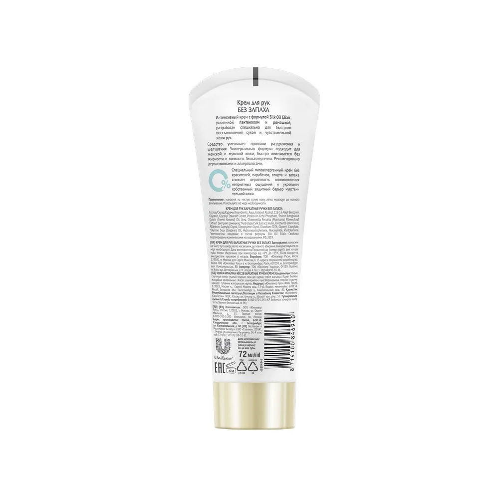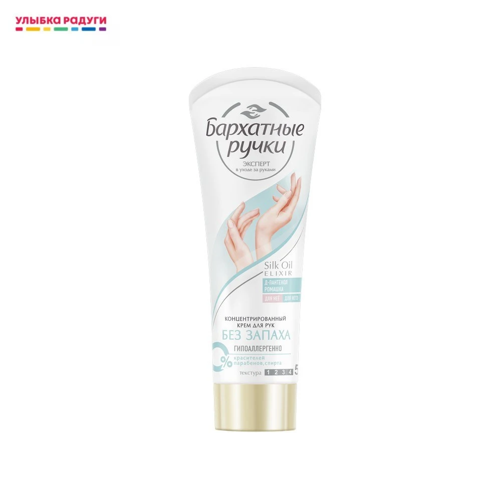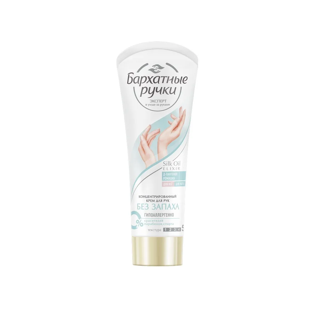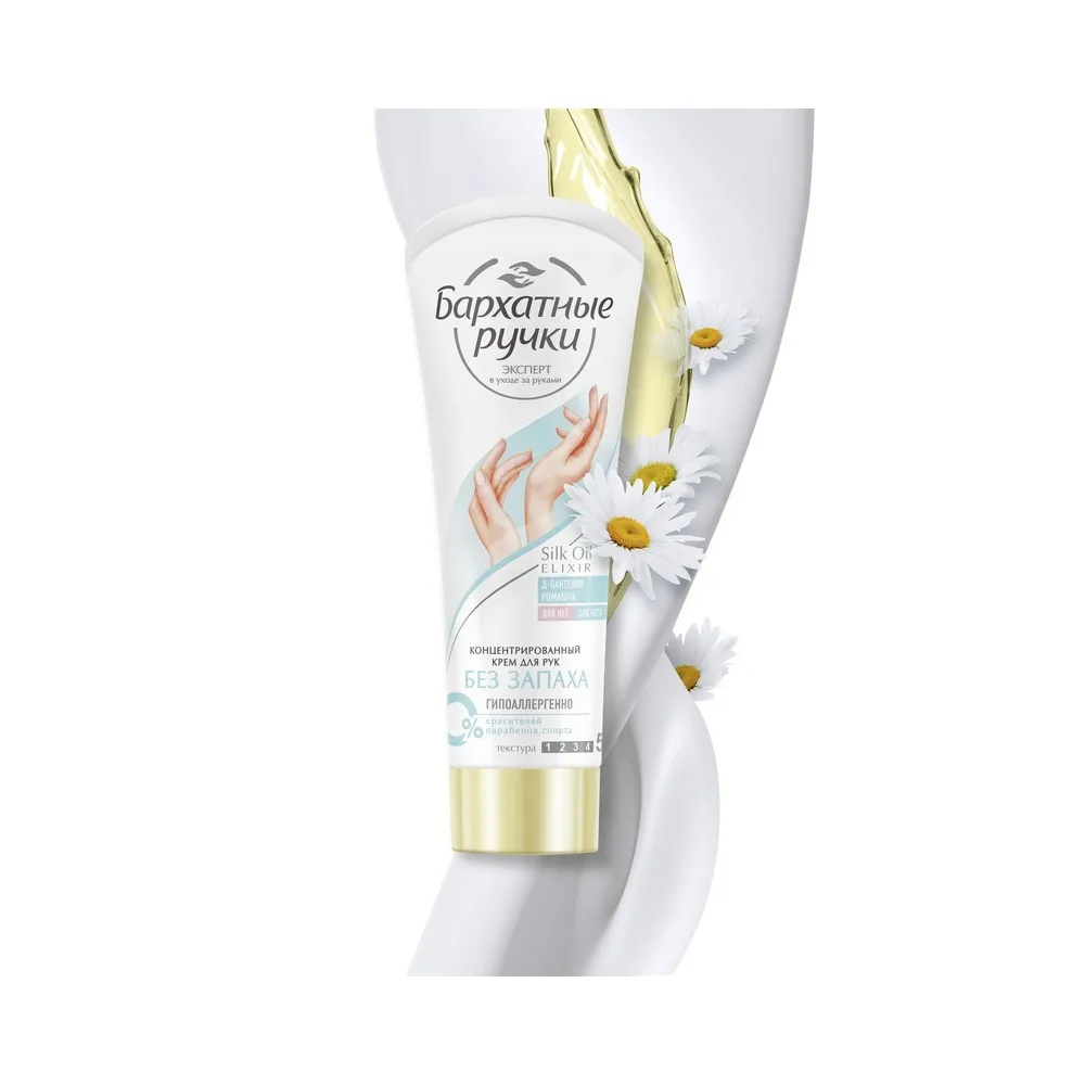 Описание от производителя:Интенсивный крем с формулой Silk Oil Elixir, усиленной пантенолом и ромашкой, разработан специально для быстрого восстановления сухой и чувствительной кожи рук. nОтдушки могут являться катализатором аллергии. Многие потребители не могут использовать крема с ярко-выраженным запахом из-за аллергической реакции. Крем Бархатные ручки не содержит отдушки и является гипоаллергенным, подходит для использования в сезон аллергии. Продукт рекомендован дерматологами и аллергологами.Крем обладает густой и ультра насыщенной текстурой, но при этом быстро впитывается без липкости и жирности. Текстура крема самая насыщенная и концентрированная из основной линейки бренда Бархатные ручки. Универсальная формула крема подходит для женской и для мужской кожи рук.nФормула содержит 100% полезные компоненты, без красителей, парабенов, спирта. Крем укрепляет собственный защитный барьер чувствительной кожи для предотвращения воздействия внешних агрессивных факторов.Д-пантенол восстанавливает и увлажняет сухую кожу рук. Ромашка успокаивает и cнимает признаки раздражения и шелушения кожи.Состав:Aqua, Cetearyl Alcohol, C12-15 Alkyl Benzoate, Glycerin, Glyceryl Stearate Citrate, Potassium Cetyl Phosphate, *Prunus Amygdalus Dulcis (Sweet Almond) Oil, Urea, Chamomilla Recutita (Matricaria) Flower/Leaf Extract (экстракт ромашки), *Hydrolyzed Silk Extract, Inulin, Panthenol (пантенол), Allantoin, Caprylyl Glycol, Dipropylene Glycol, Disodium EDTA, Glyceryl Caprylate, *Glycine Soja (Soybean) Oil, Hydroxyacetophenone, Niacinamide, Pantolactone.*компоненты, входящие в состав формулы Silk Oil Elixir.Способ применения:Наносите на чистую сухую кожу, легко массируя до полного впитывания. Используйте по мере необходимости.Тип кожи:Для сухой и чувствительной кожиТекстура:Насыщенная кремовая