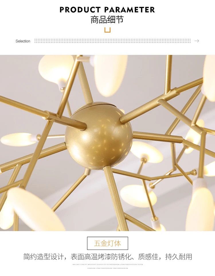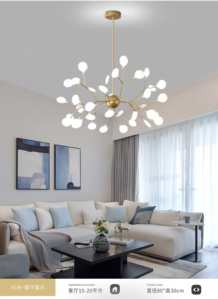 Параметры продуктаДлина подвесного провода составляет 100 см, а его длину можно отрегулироватьРазмер: 9 ламп Dia55xH45cm27 ламп Dia65xH55cm36 ламп Dia75xH60cm45 ламп Dia80xH65cm54 лампы Dia85xH65cm