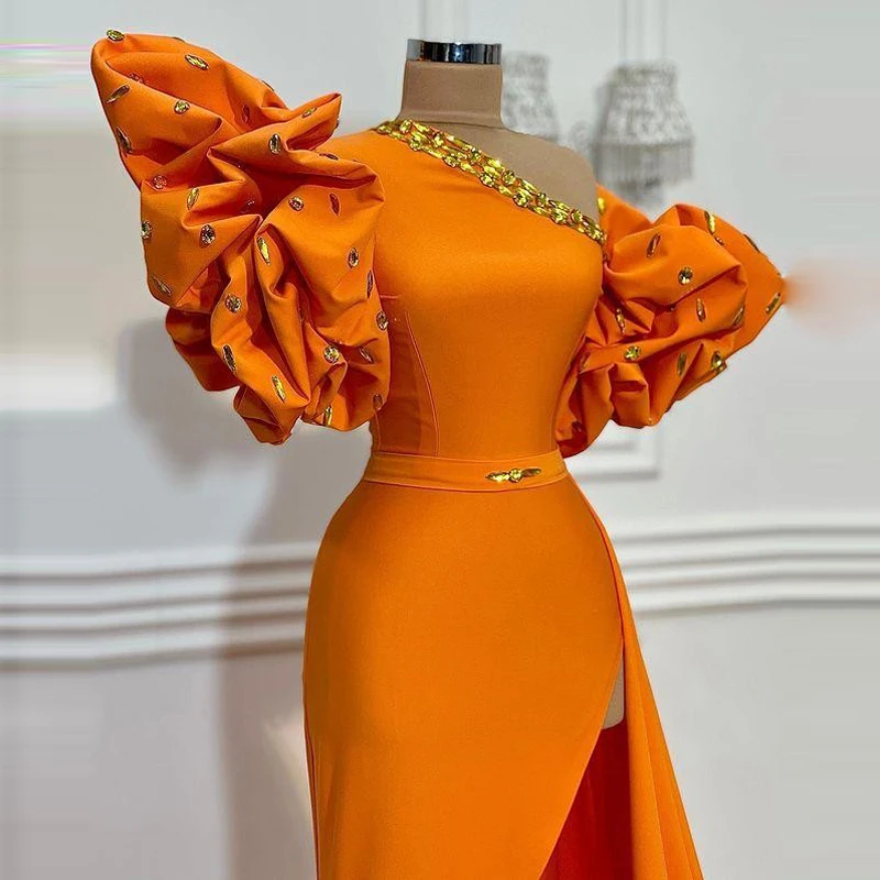 Платье оранжевое на одно плечо для выпускного вечера, пикантное атласное вечернее с пышными короткими рукавами и Боковым Разрезом, дешевое коктейвечерние Лето 2021