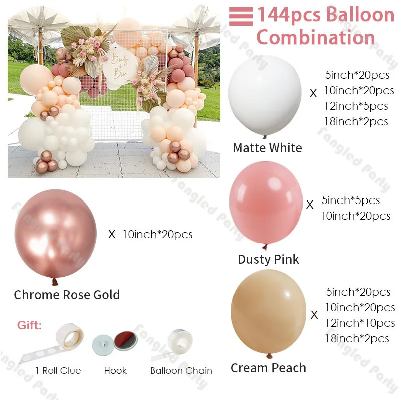 Матовый белый (5 дюймов * 20 шт., 10 дюймов * 20 шт., 12 дюймов * 5 шт., 18 дюймов * 2 шт.)Пыльно-розовый (5 дюймов * 5 шт., 10 дюймов * 20 шт.)Кремовый персик (5 дюймов * 20 шт., 10 дюймов * 20 шт., 12 дюймов * 10 шт., 18 дюймов * 2 шт.)Хромовое розовое золото 10 дюймов * 20 штБесплатно: 1 рулонный клейЦепочка для воздушных шаров, крючок